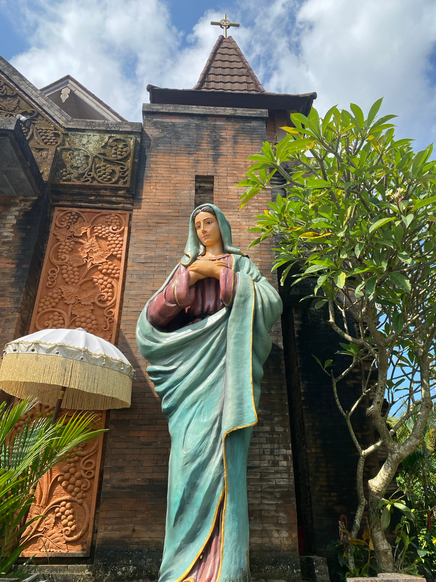 A statue of Mary stands outside a brick building in North Kuta, Indonesia. The statue is wearing a light green robe and is positioned in front of a wall with carved grape designs. A tree with green le…read more