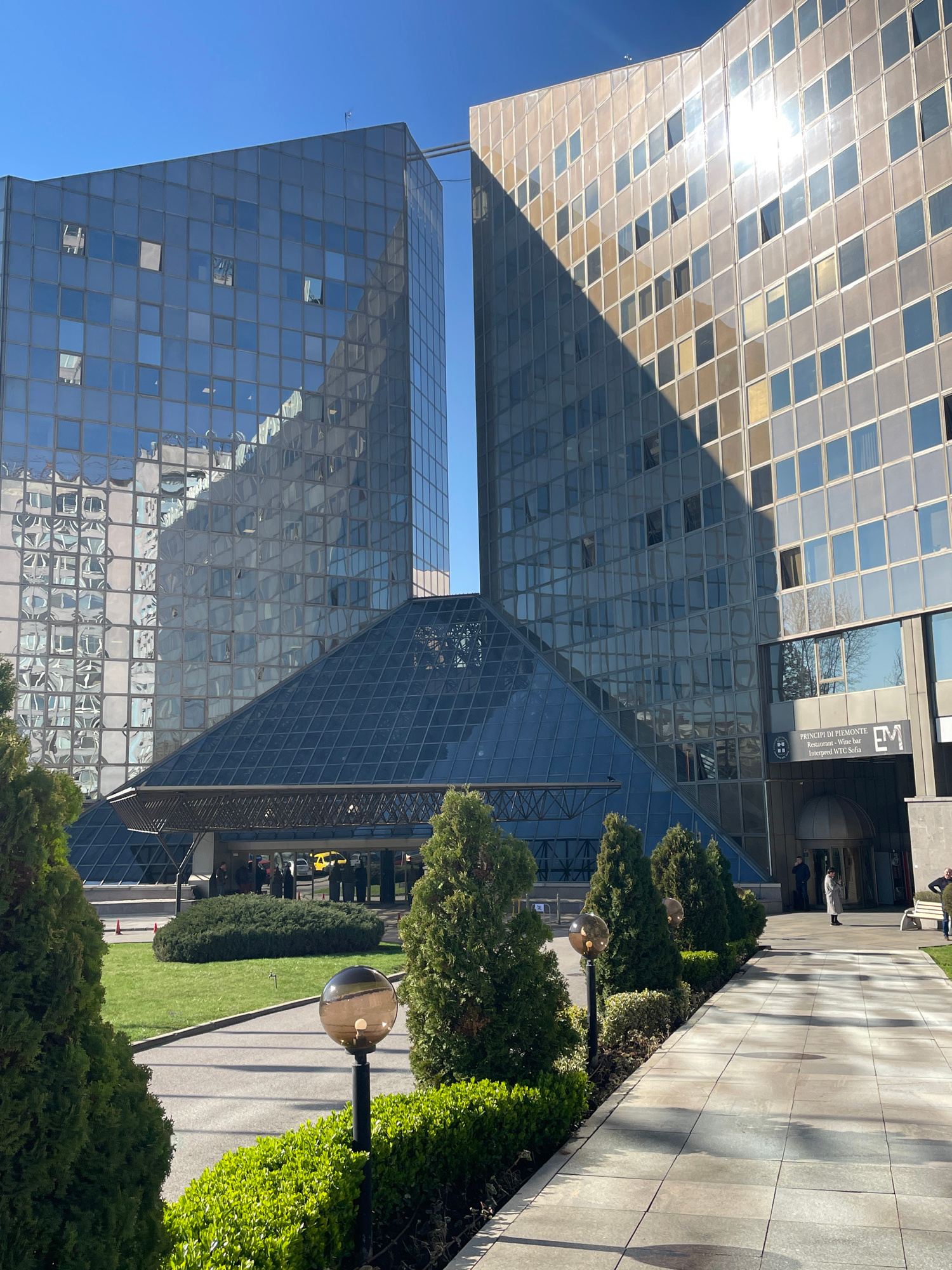 Here's a detailed description of the image: **Overview:** The image shows a modern architectural scene with glass-facaded buildings, landscaping, and pedestrian areas. **Location:** Based on the sig…read more