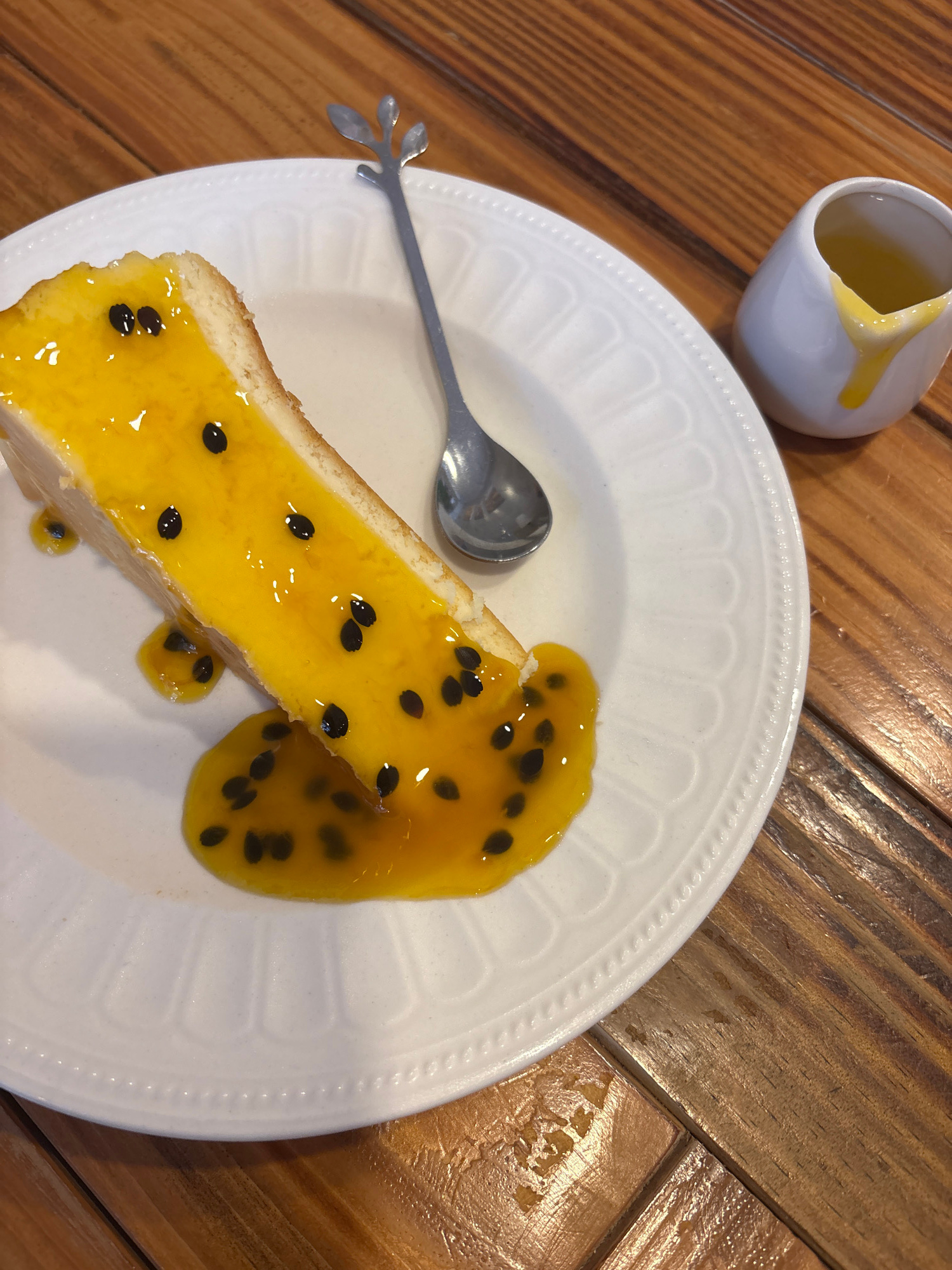 A slice of dessert, likely a cheesecake or light cake, is prominently featured on a white ceramic plate. The cake is generously covered with a vibrant yellow passion fruit sauce, clearly showing numer…read more