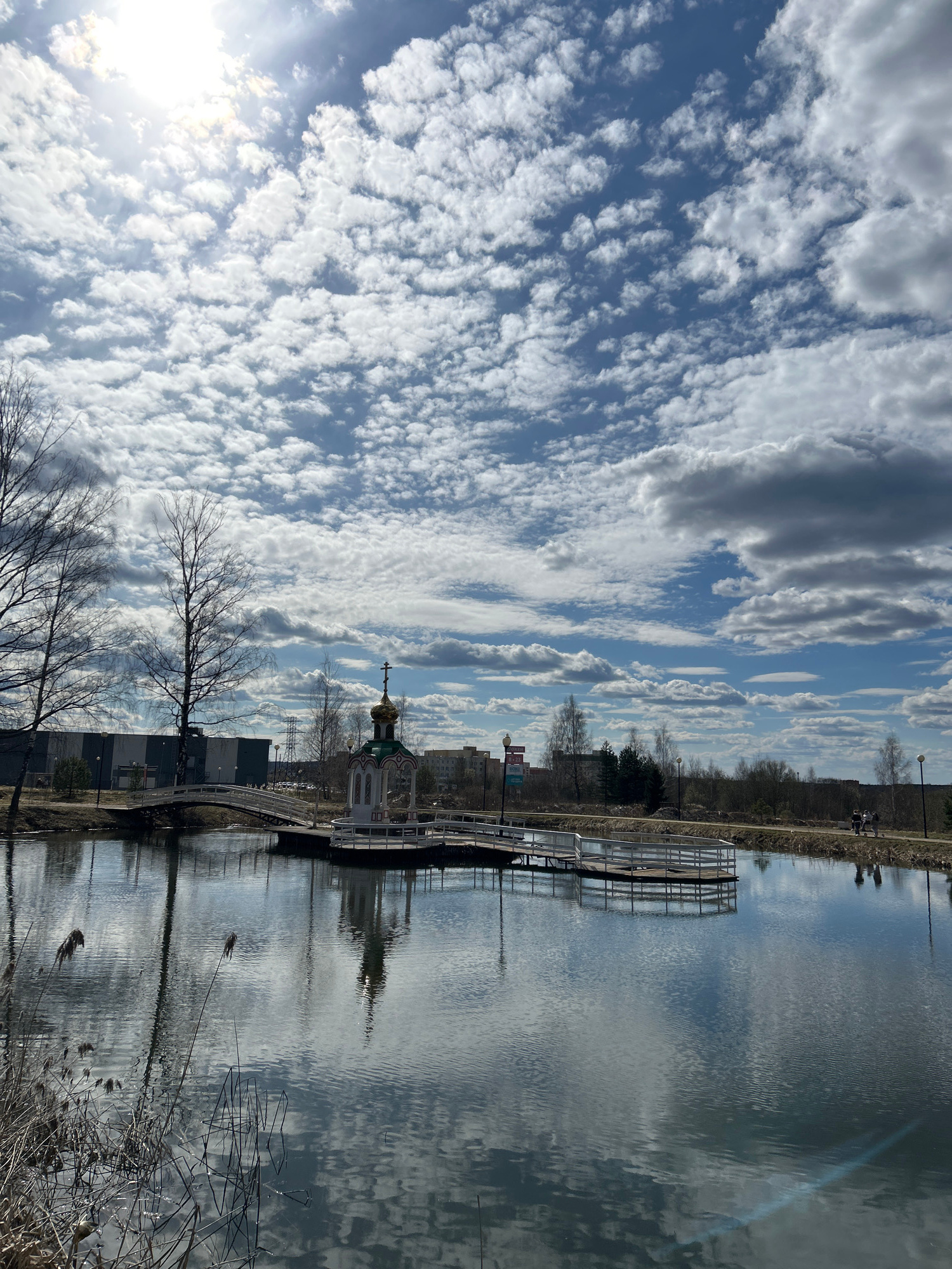 The image is a landscape oriented scene with a body of water in the center. The sky is filled with altocumulus clouds. There is a walkway leading to a small structure with a green and gold dome, possi…read more