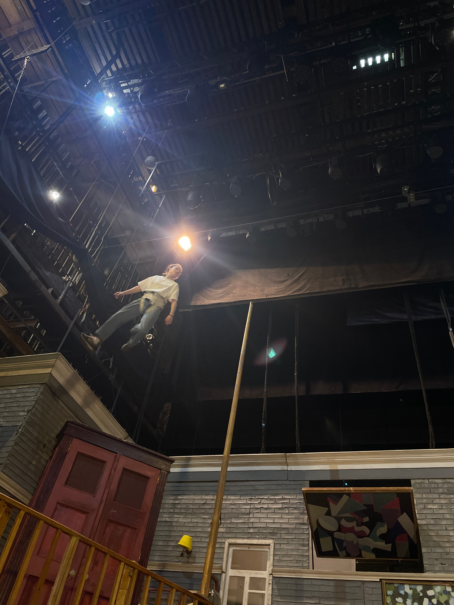 The image depicts an intricate theatrical stage setup, viewed from a low angle, within the Moscow Art Theatre (МХАТ) in Moscow, Russia. A single individual, appearing young with medium-length dark ha…read more