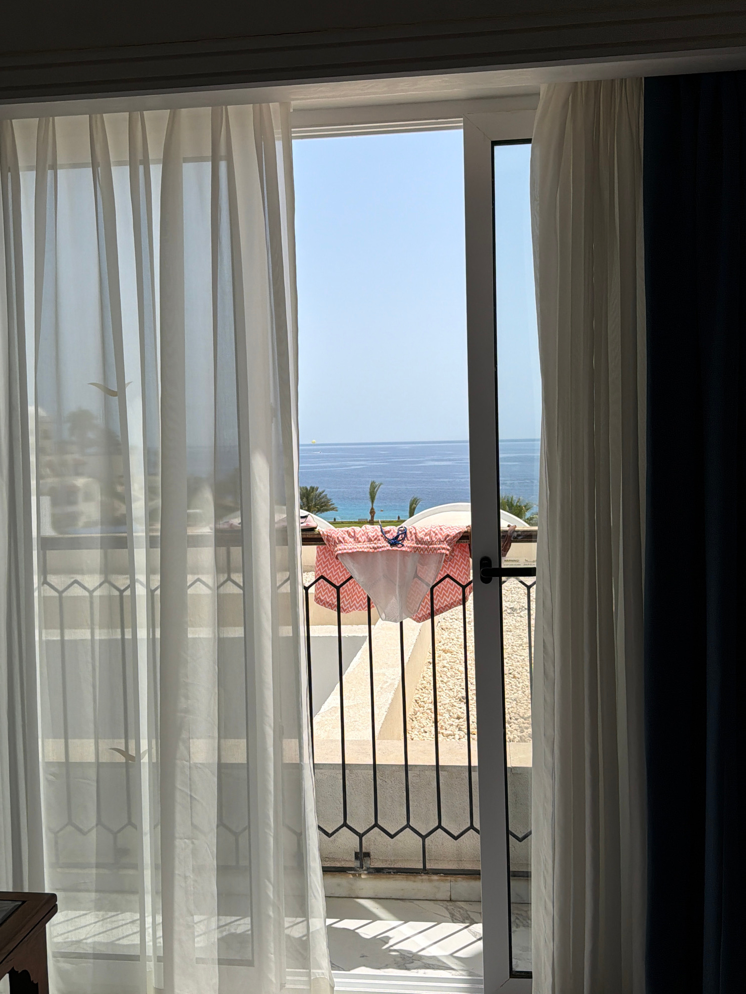 The image captures a serene outdoor view from an indoor perspective, looking out through a window onto the Red Sea in Sharm El Sheikh, Egypt. In the immediate foreground, a white window frame borders…read more