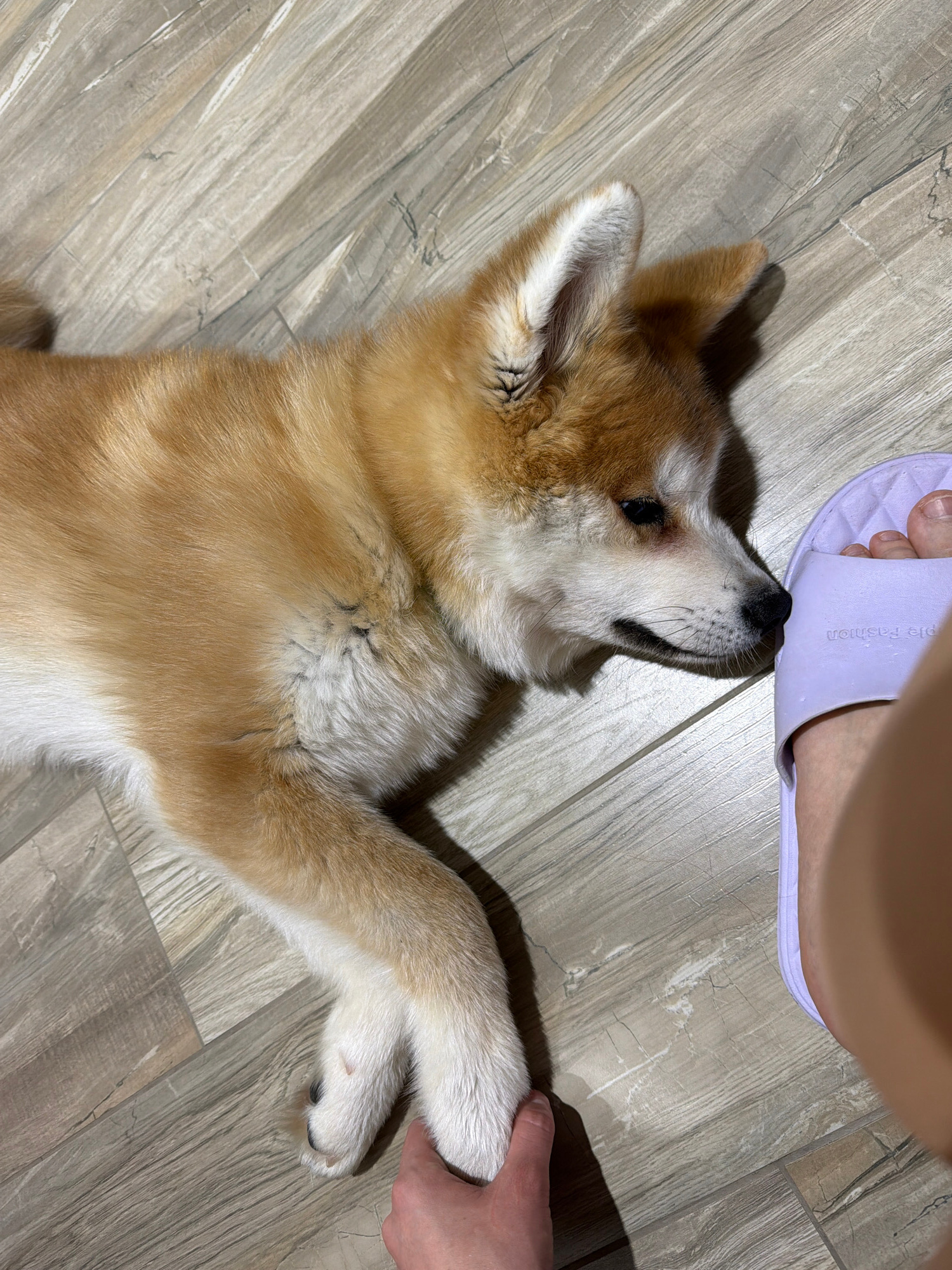 An Akita puppy is lying on a wood-look laminate floor. The puppy is light brown with white markings on its belly, legs, and face. It is looking up at a foot in a lavender sandal. A human hand is holdi…read more