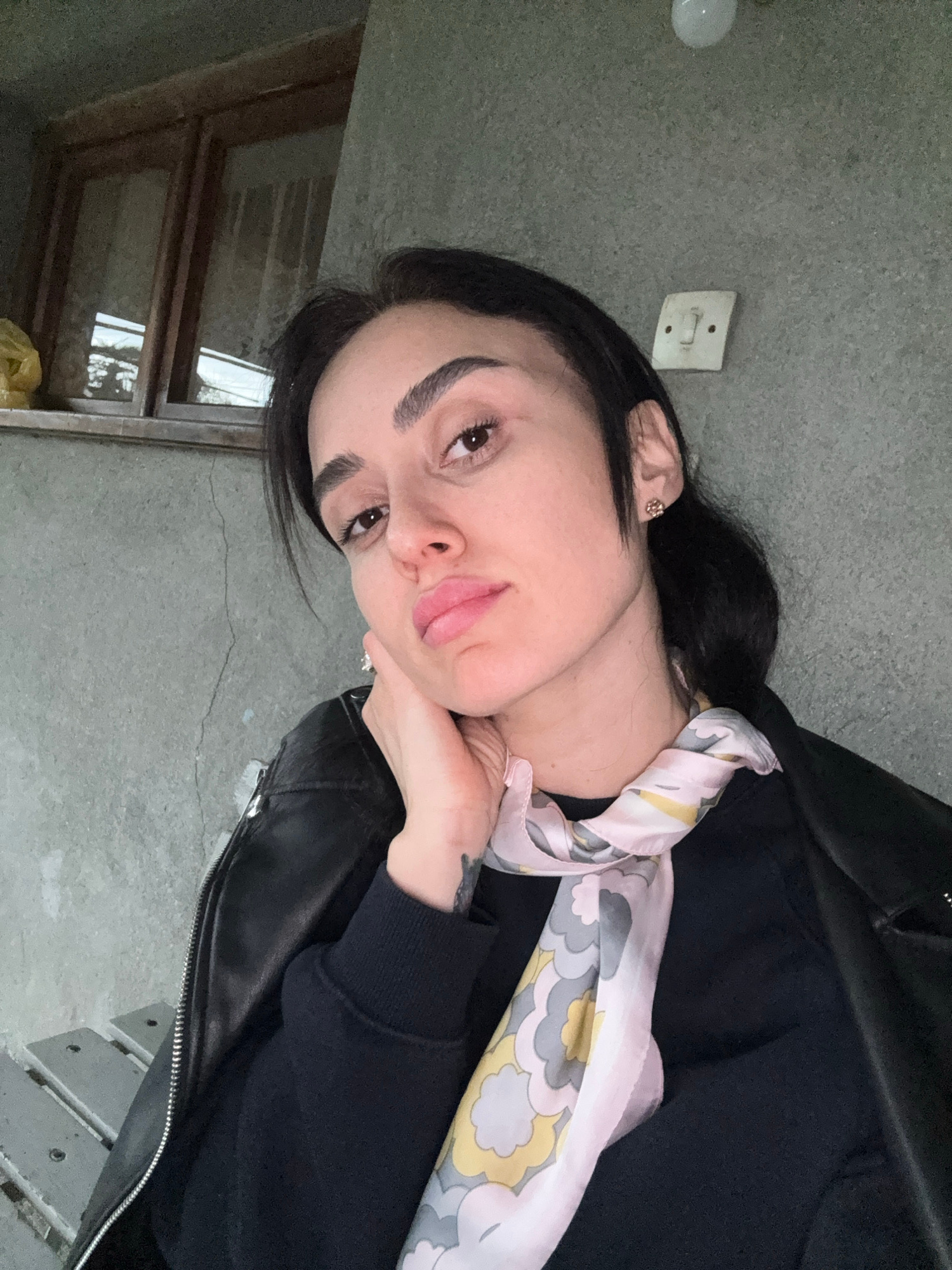 A woman with dark hair and pronounced eyebrows rests her chin on her hand, posing for a photograph. She wears a black jacket and a patterned scarf. The location appears to be indoors, possibly in a ro…read more