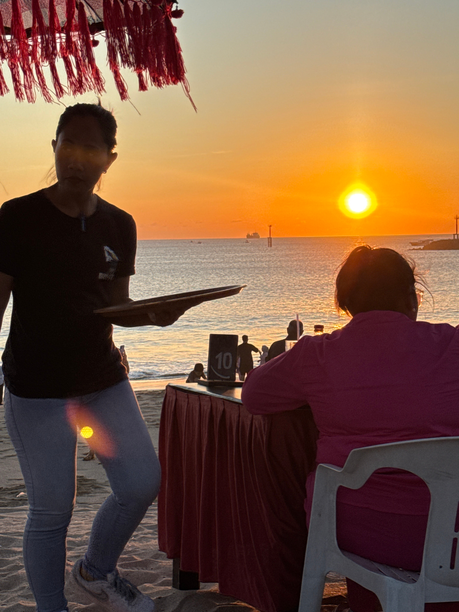 The image captures a sunset scene on a beach, likely in Kuta, Indonesia, with two individuals and beachside dining setups. The time of day is sunset, indicated by the large, bright orange sun low on t…read more