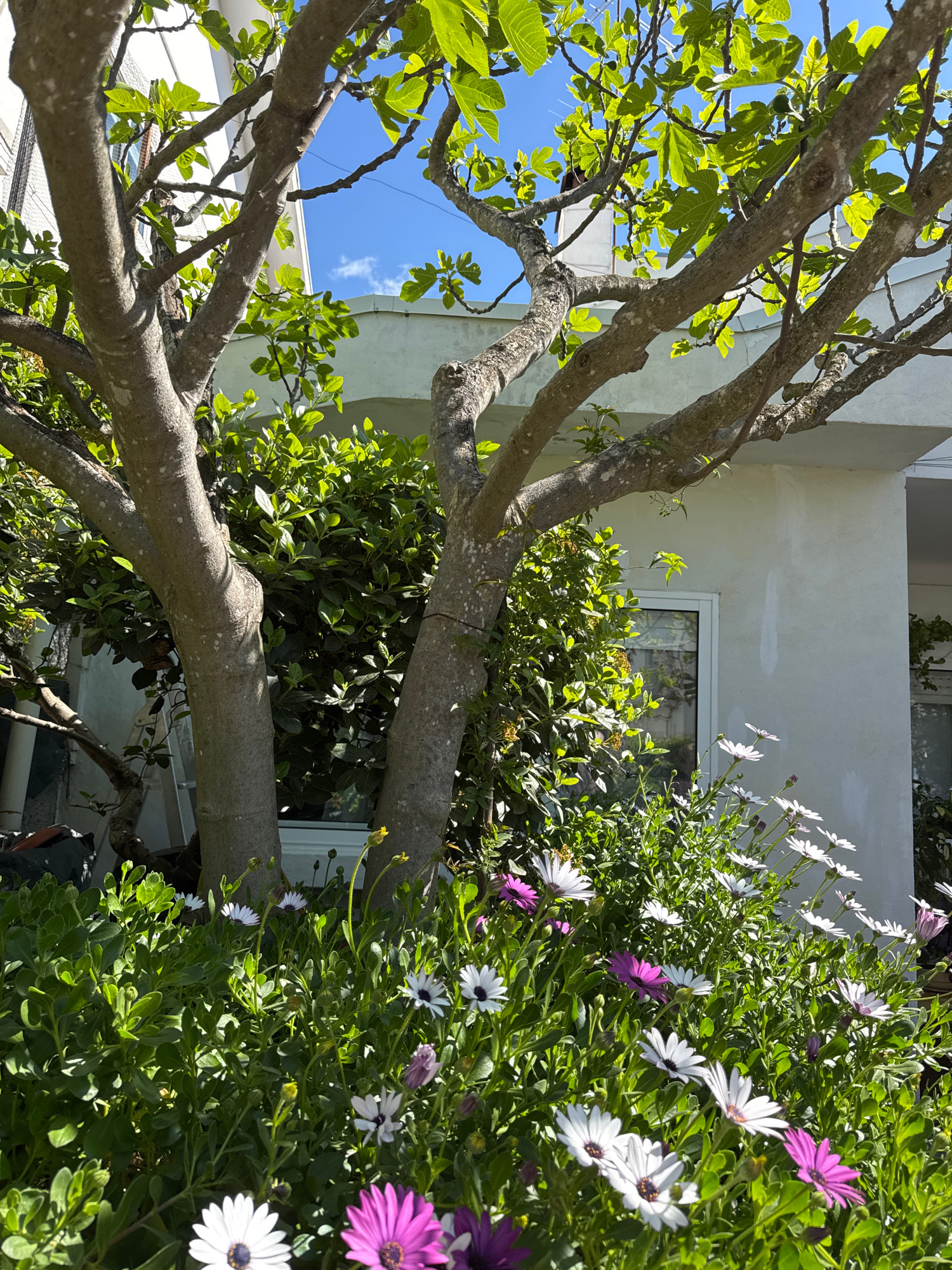 This image depicts an outdoor garden scene in Mirandela, Portugal, under bright daylight with a clear blue sky and sparse white clouds visible overhead. In the immediate foreground and midground, two…read more