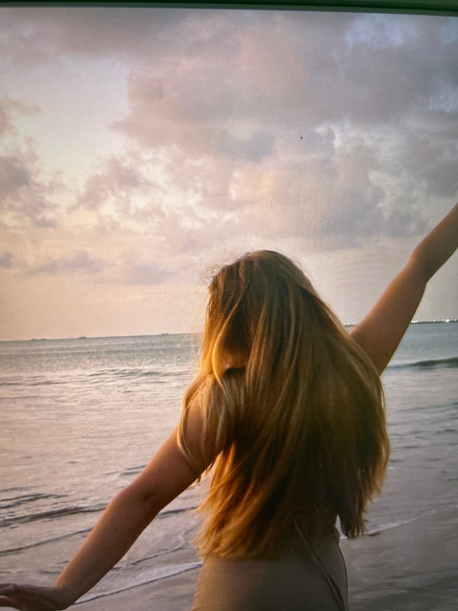 A woman stands on the beach with her arms outstretched. The sky is cloudy, and the water is calm. It is likely the location is in Kuta Selatan, Indonesia.
