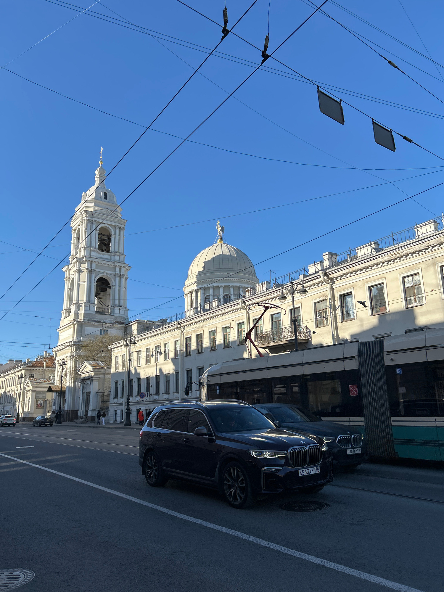 This image captures a bright, sunny urban street scene in Saint Petersburg, Russia. The primary subjects include a striking white architectural complex dominated by an ornate bell tower with arched o…read more