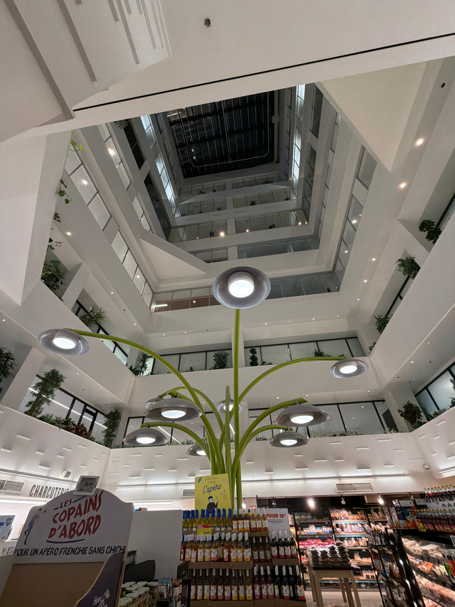 The image shows an interior view of a multi-story building. It appears to be taken from a low angle looking up through an atrium or open central space. The architecture is characterized by white walls…read more