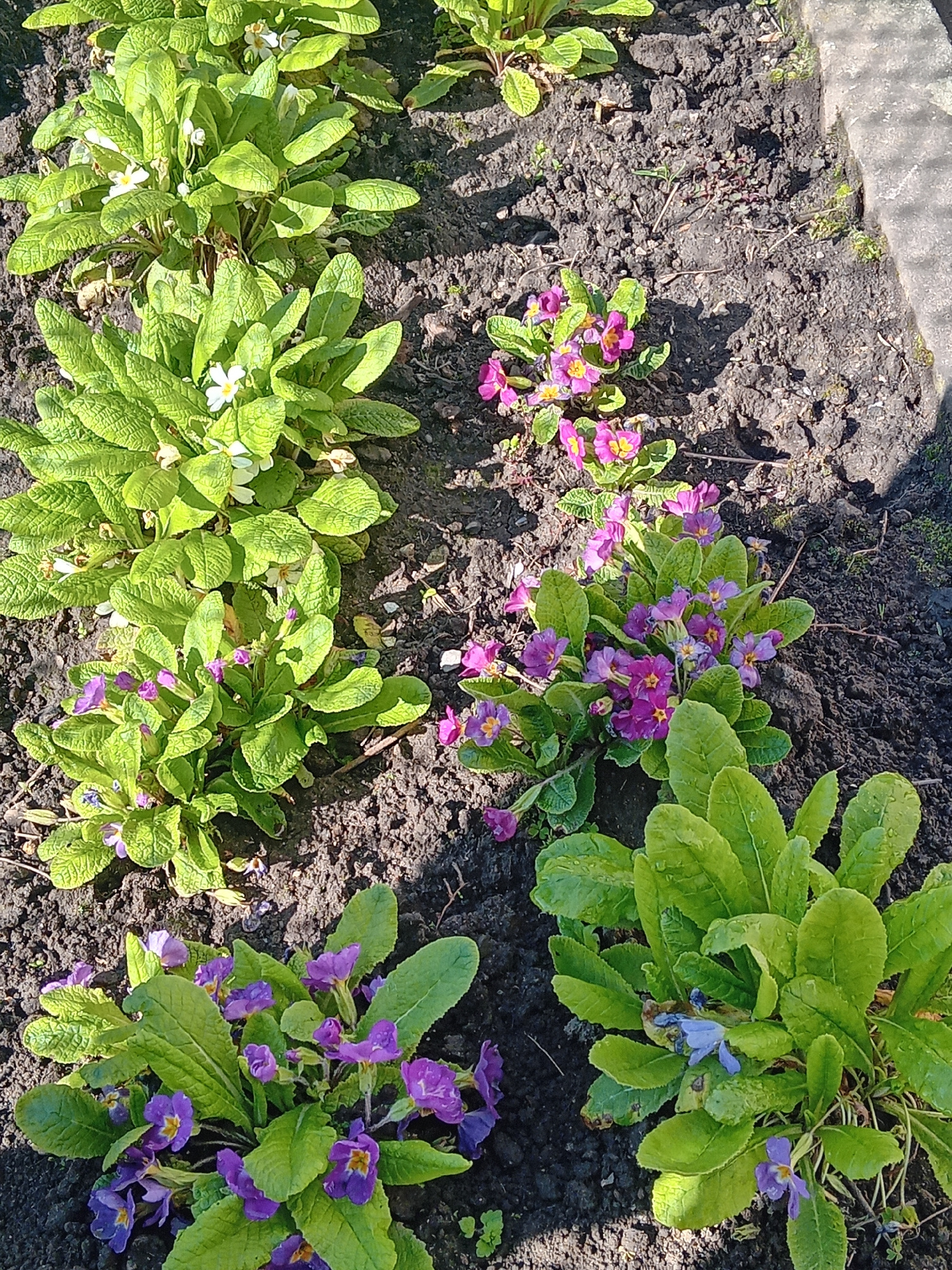 A high-angle, outdoor shot shows a row of flowering plants growing in a garden, next to a concrete edge. The soil appears dark and rich. The plants feature prominent green leaves, with a mix of pink,…read more