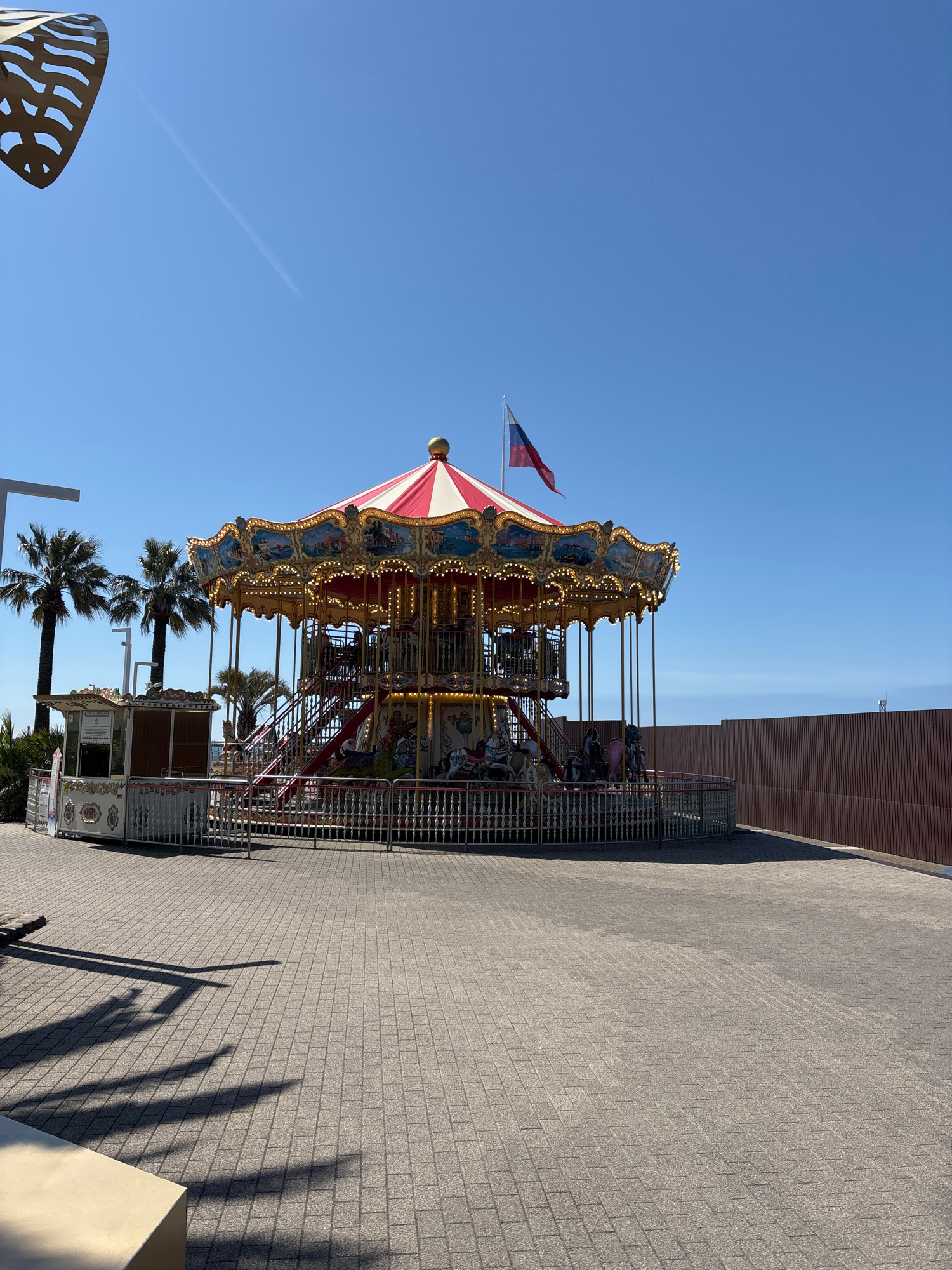 Here's a detailed description of the image: The image shows a brightly lit, two-tiered carousel against a clear blue sky. The carousel is decorated with gold trim and has a red and white striped roofβ¦read more