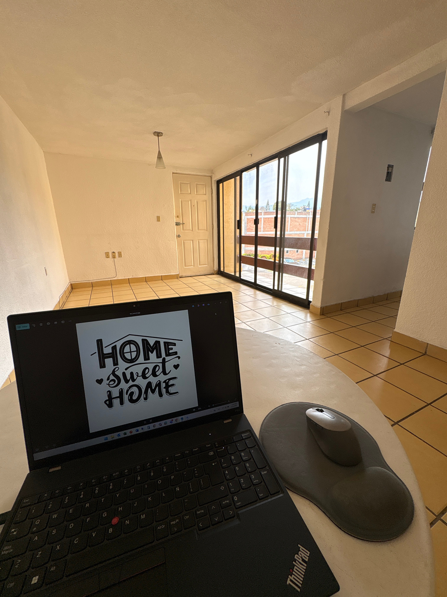 Here is a description of the image: The image is taken from a high-angle perspective, showing a room interior with a laptop on a round table. The laptop screen displays the words "Home Sweet Home" inβ¦read more