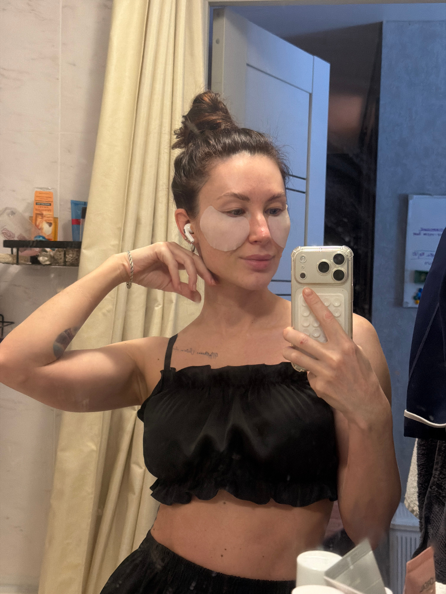 This mirror selfie, taken in a setting that appears to be a bathroom, likely in Perm, Russia, is rotated 90 degrees clockwise. The main subject is a woman with dark hair tied back, who is applying und…read more