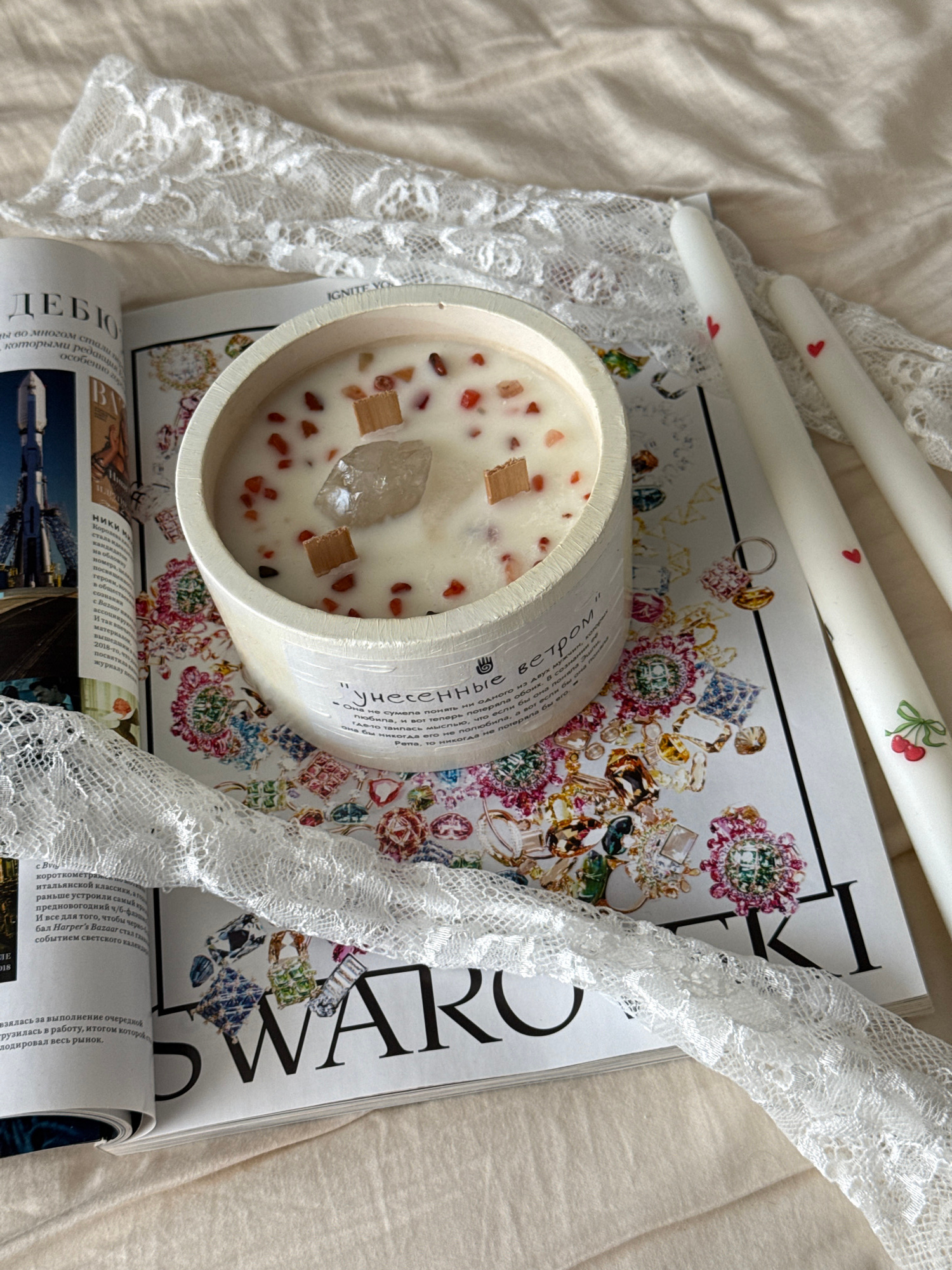 The image presents a close-up, top-down view of a styled arrangement featuring a decorative candle, two taper candles, and an open magazine, all resting on a soft, light-colored fabric surface, possib…read more