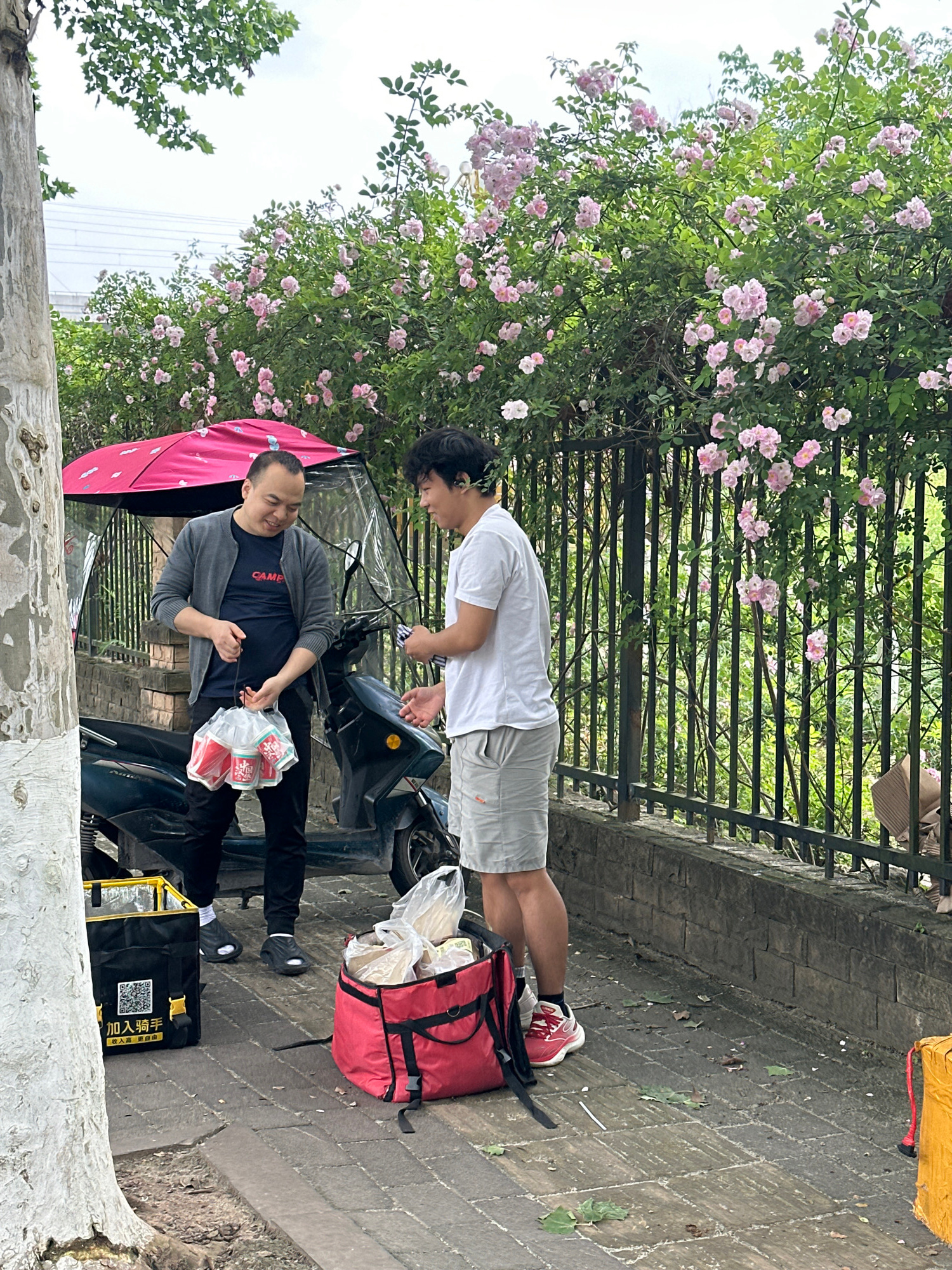 Two Asian men stand next to a black three-wheeled motorcycle on a paved path. The man in the foreground wears a gray cardigan over a dark shirt and black pants, and holds packages of food. The man in…read more