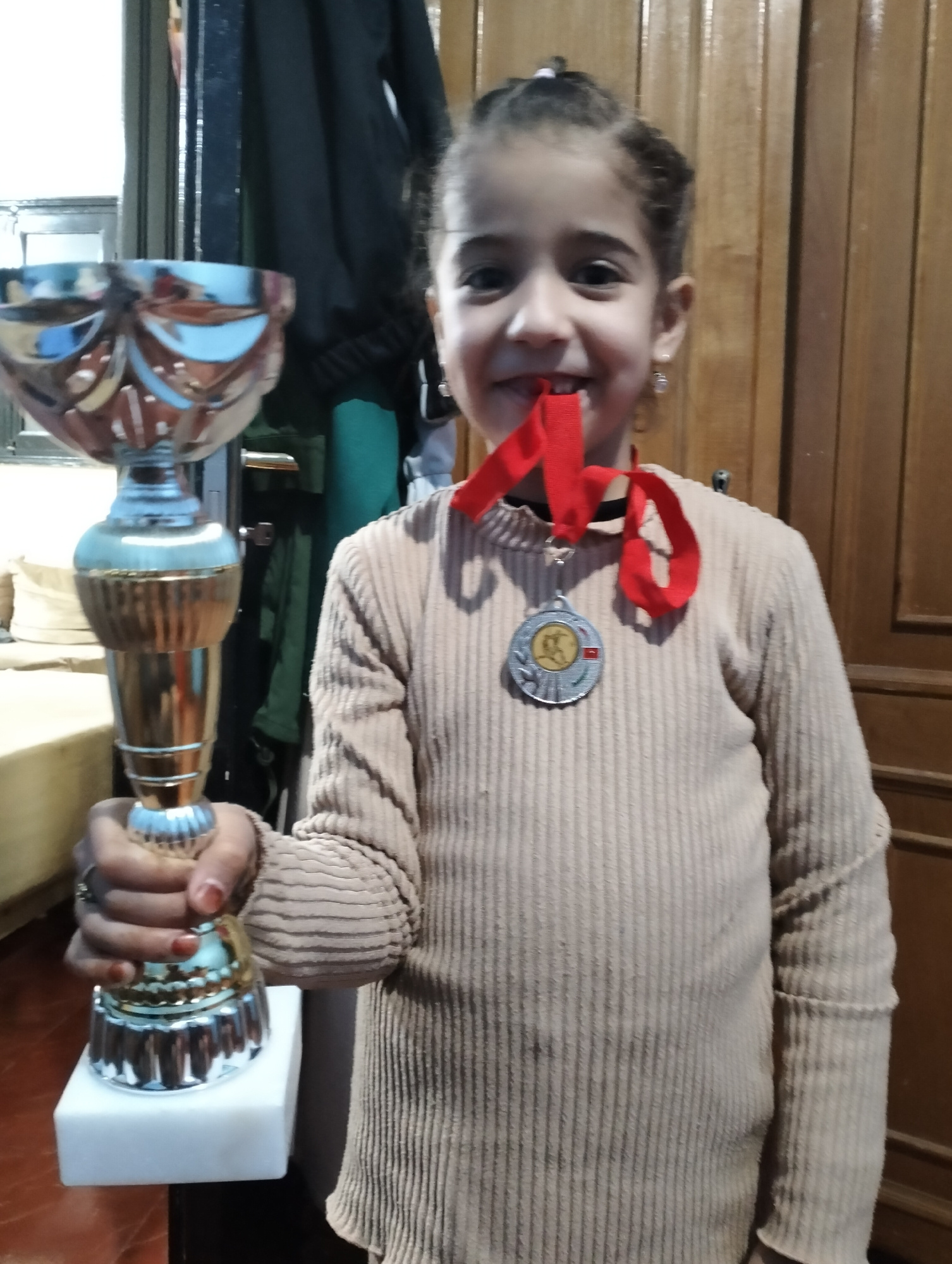A young girl is indoors, holding a silver and gold trophy in her left hand, and a silver medal with a red ribbon is around her neck. She's biting the ribbon and smiling. The location is likely Ouaouiz…read more