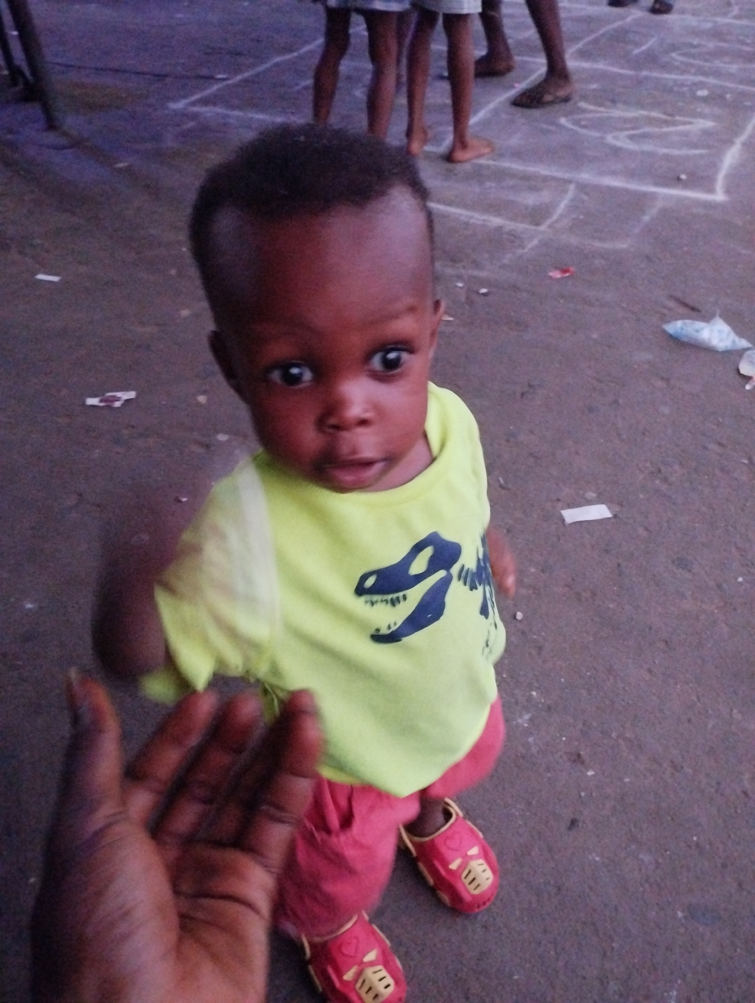 A child stands on a pavement, possibly in Fegge, Nigeria given the request. The child wears a light green shirt with a dinosaur graphic, red pants, and red shoes. A hand is partially visible in the foβ¦read more