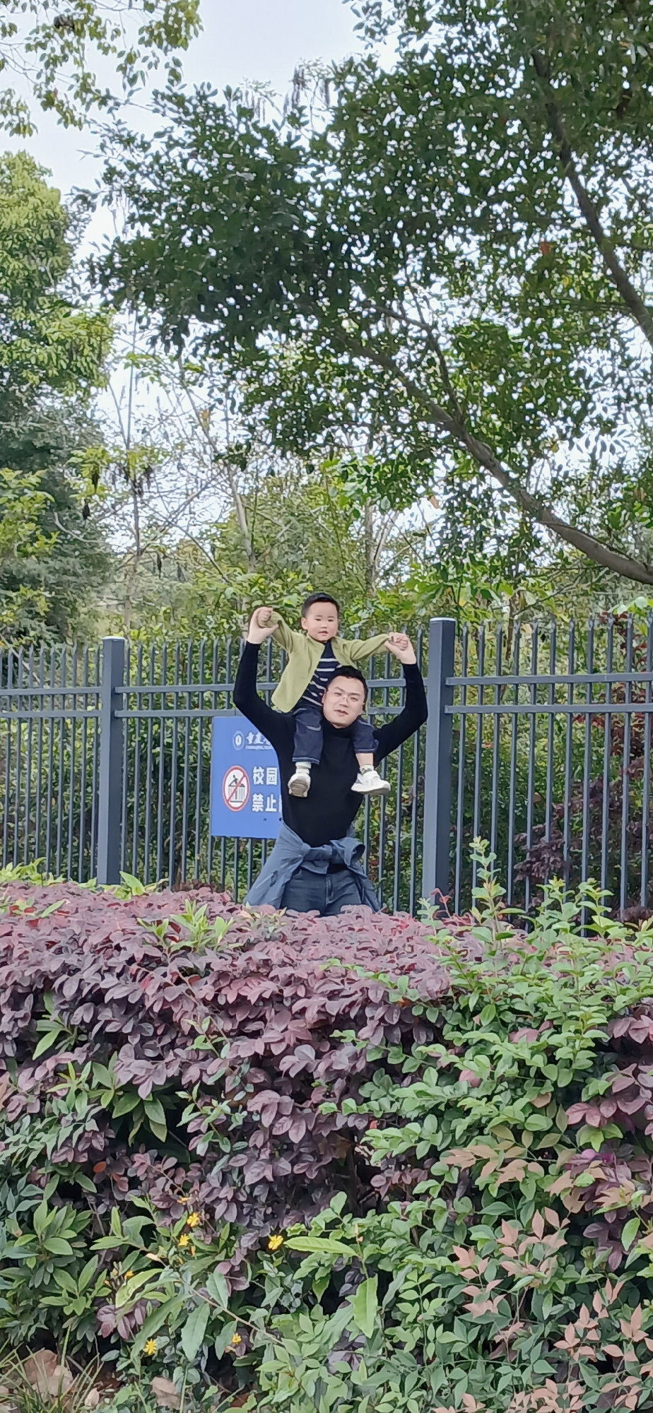 A man and a child are posing in front of a fence next to a bush in the Chongqing High-tech Zone, China. The man is wearing a black shirt and blue jeans, and the child is wearing a green shirt and whit…read more