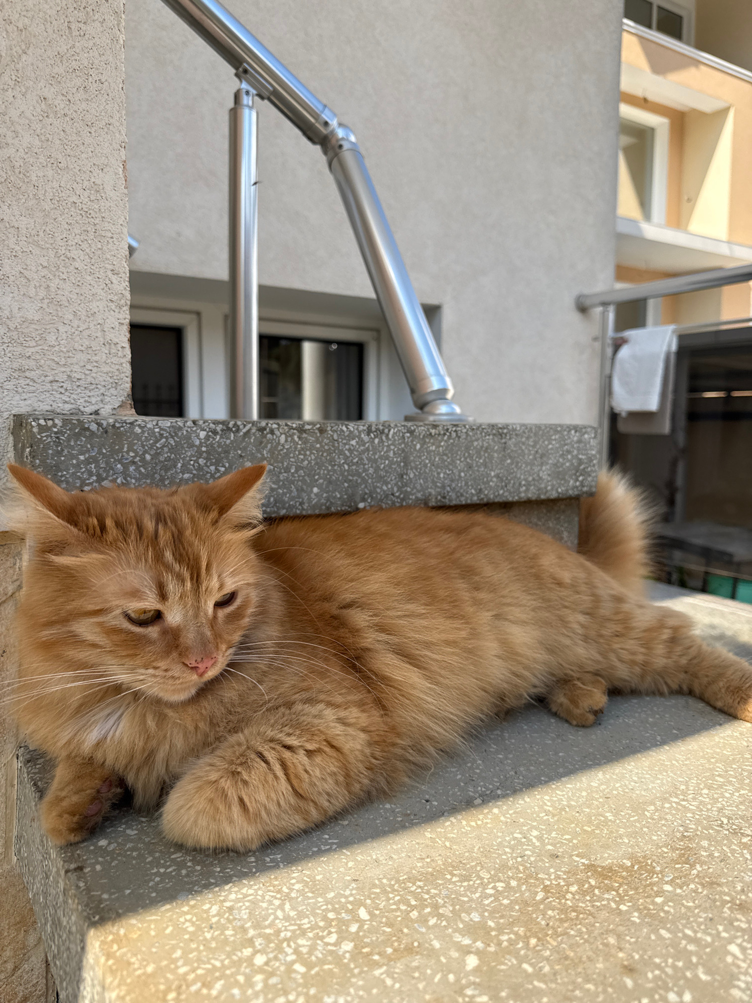 A fluffy, long-haired orange (ginger) cat is captured lying in a relaxed pose on a sunlit, light-colored, textured surface, likely a concrete or stone step. The cat, with its golden-brown eyes and lon…read more
