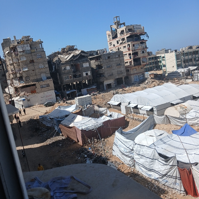 This image depicts a severely damaged urban landscape in Gaza City, Palestinian Territory, under a clear blue sky. In the background, numerous multi-story concrete buildings exhibit extensive structur…read more