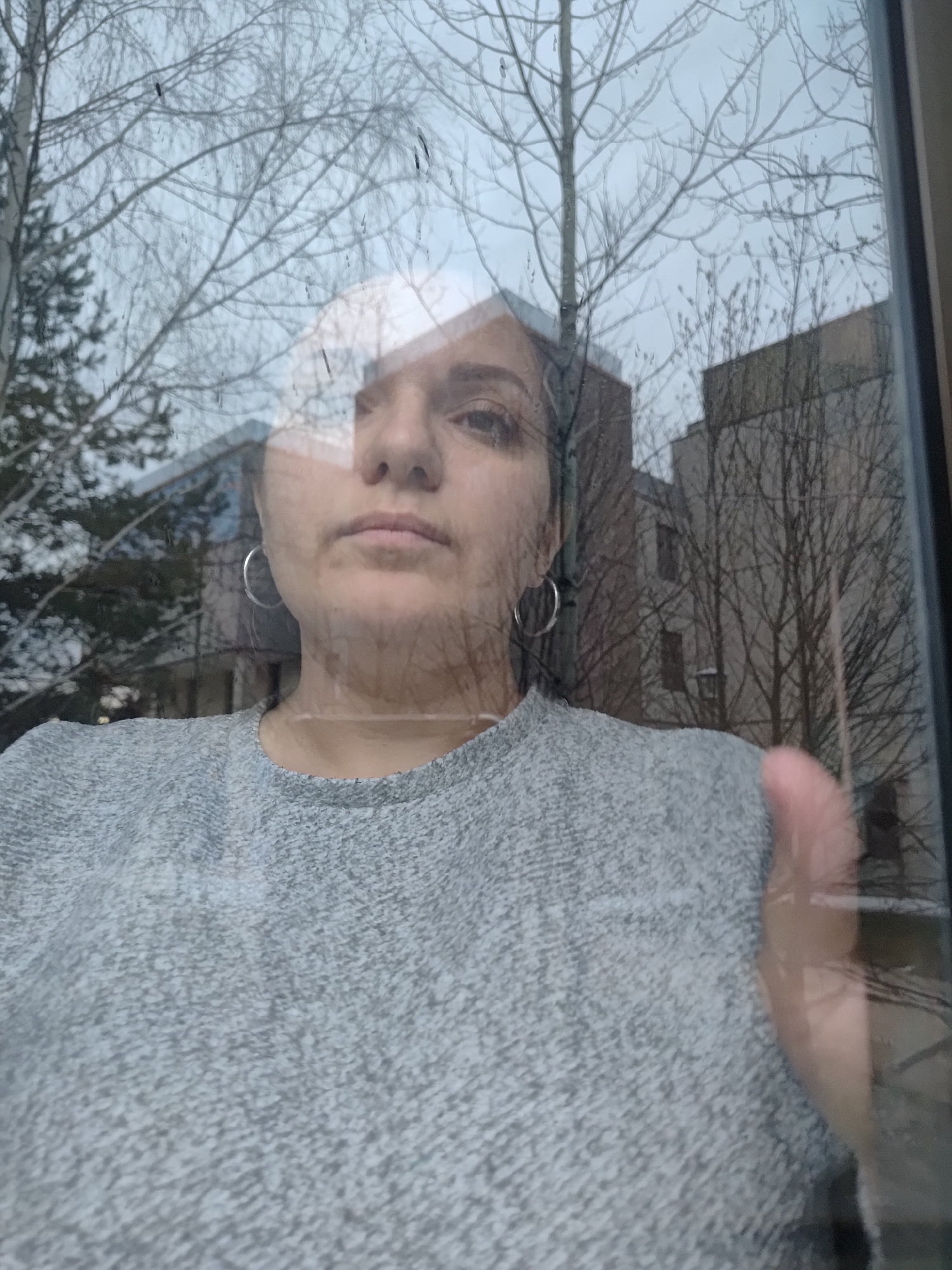 The image, rotated 90 degrees clockwise, captures a reflection of a person in a window, superimposed over an outdoor scene. On the right side of the frame, the upper body and face of a woman are visib…read more