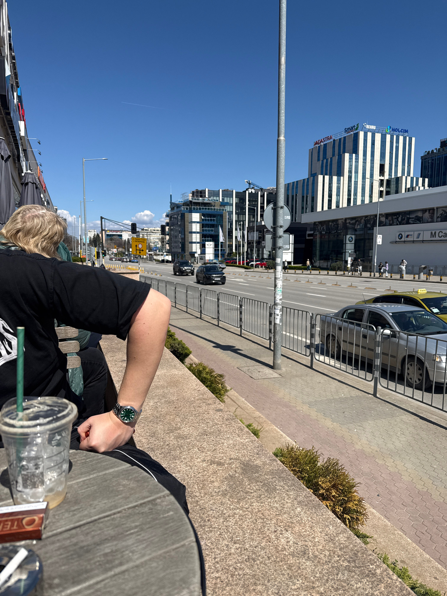A medium shot, taken in Sofia, Bulgaria, depicts a person lounging on a wooden bench in an urban environment. The individual, seen from an elevated vantage point, is wearing a black t-shirt and pants,…read more