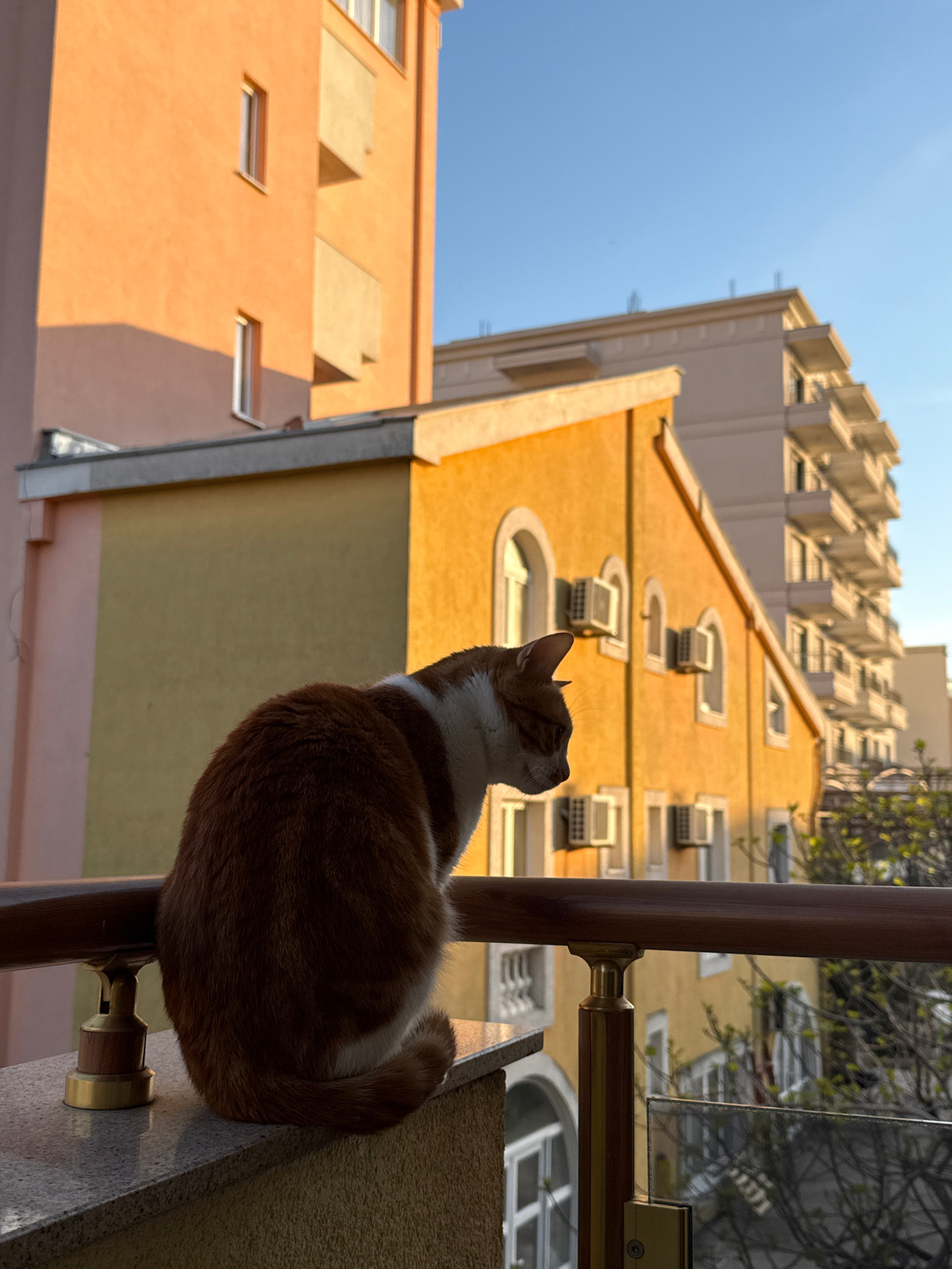 A low-angle, outdoor shot depicts an orange and white cat resting on a ledge in an urban environment. The cat faces away from the viewer, looking up at the surrounding architecture. Behind the cat are…read more