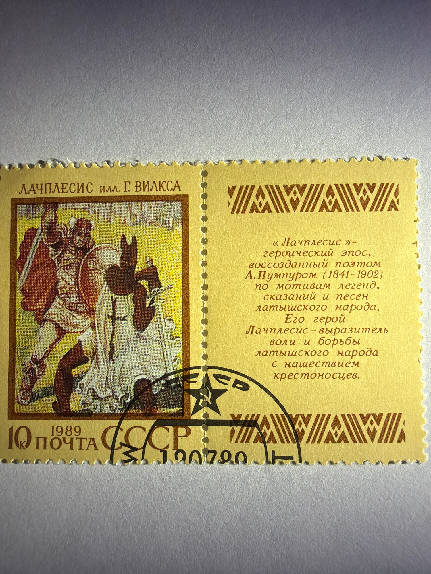 The image shows a USSR postage stamp from 1989. The stamp commemorates the Latvian epic hero, "Lāčplēsis" (Лачплесис), illustrated by G. Vilks. The lower stamp depicts a scene of Lāčplēsis in battle,…read more