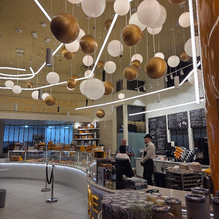 A modern indoor space features a curved service counter with pastries and beverages displayed. Behind the counter, two individuals are working. Above, decorative lighting with spherical shapes in whit…read more