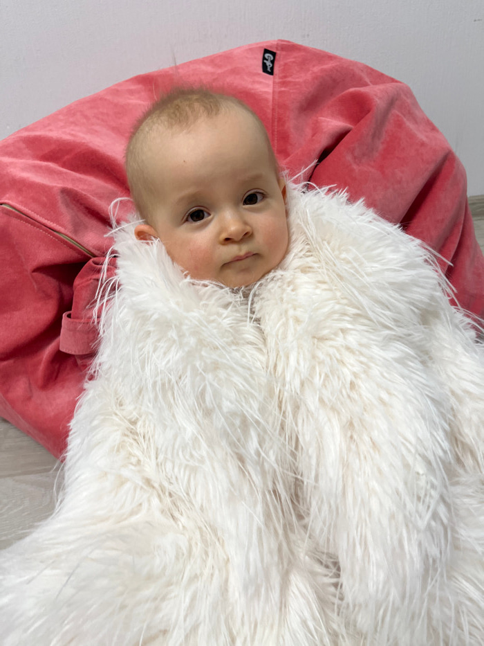 A baby lies nestled on a faded pink beanbag. The child is mostly enveloped in a fluffy, white blanket that frames their face. The baby has fair skin, a few freckles, and brown eyes, looking directly a…read more