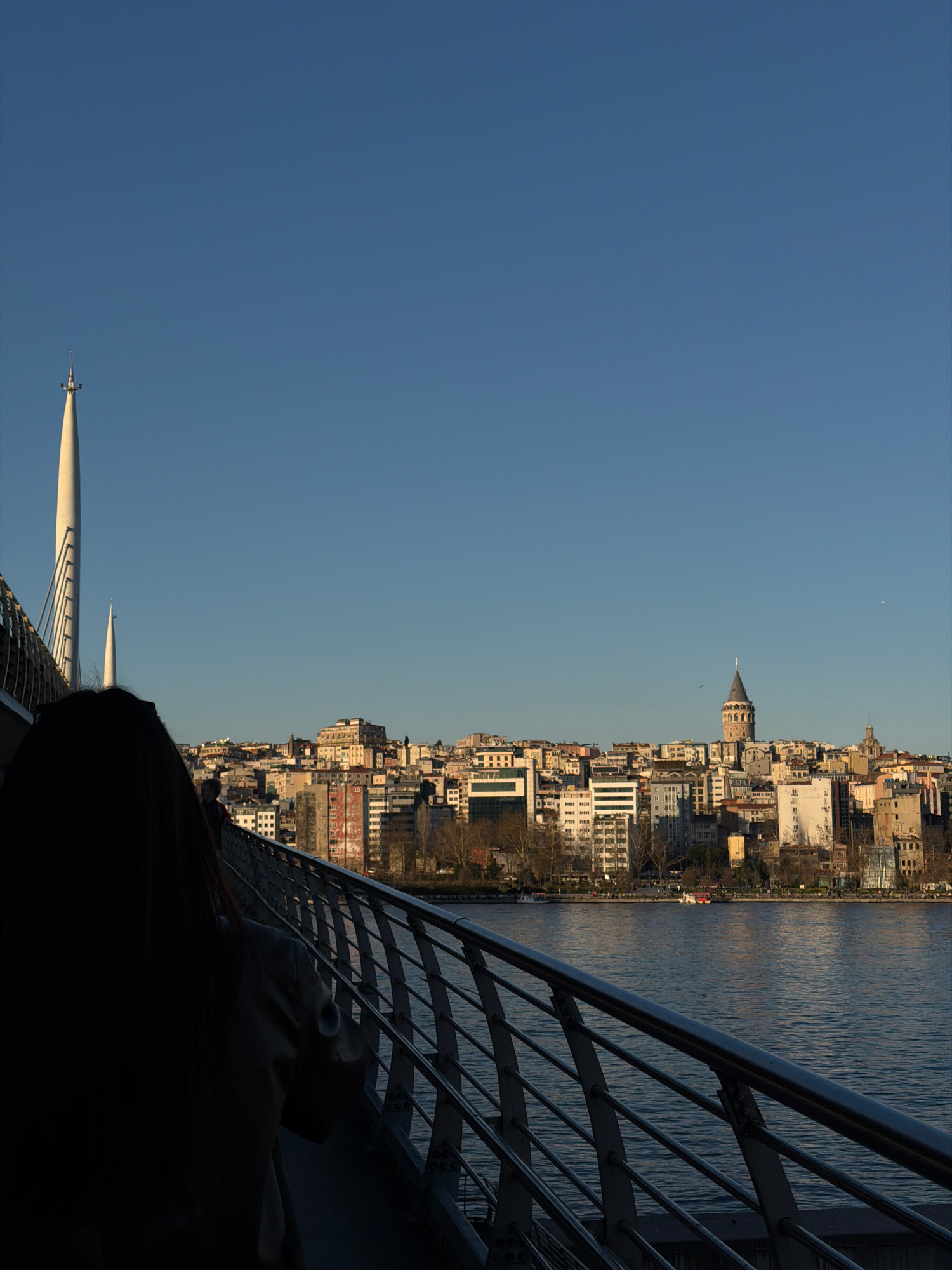 The image shows a daytime view of Istanbul, Turkey, from a bridge. The city skyline is visible with numerous buildings, including the Galata Tower, a prominent landmark. Water is visible on the right…read more