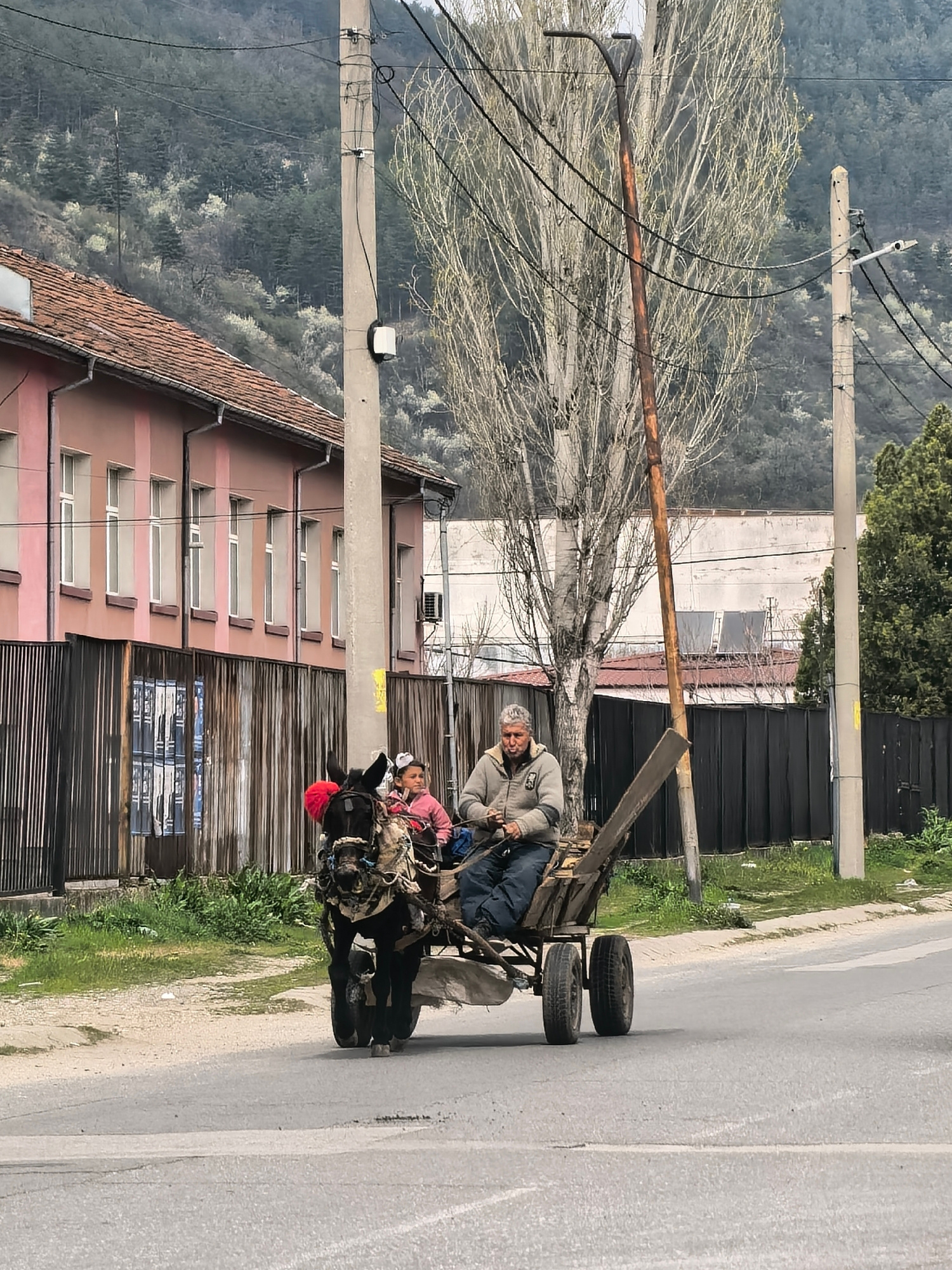 In an urban scene, a donkey pulls a cart carrying two people along an asphalt road. The cart is a basic wooden frame with four small wheels. The donkey is adorned with red pompoms on its harness. The…read more