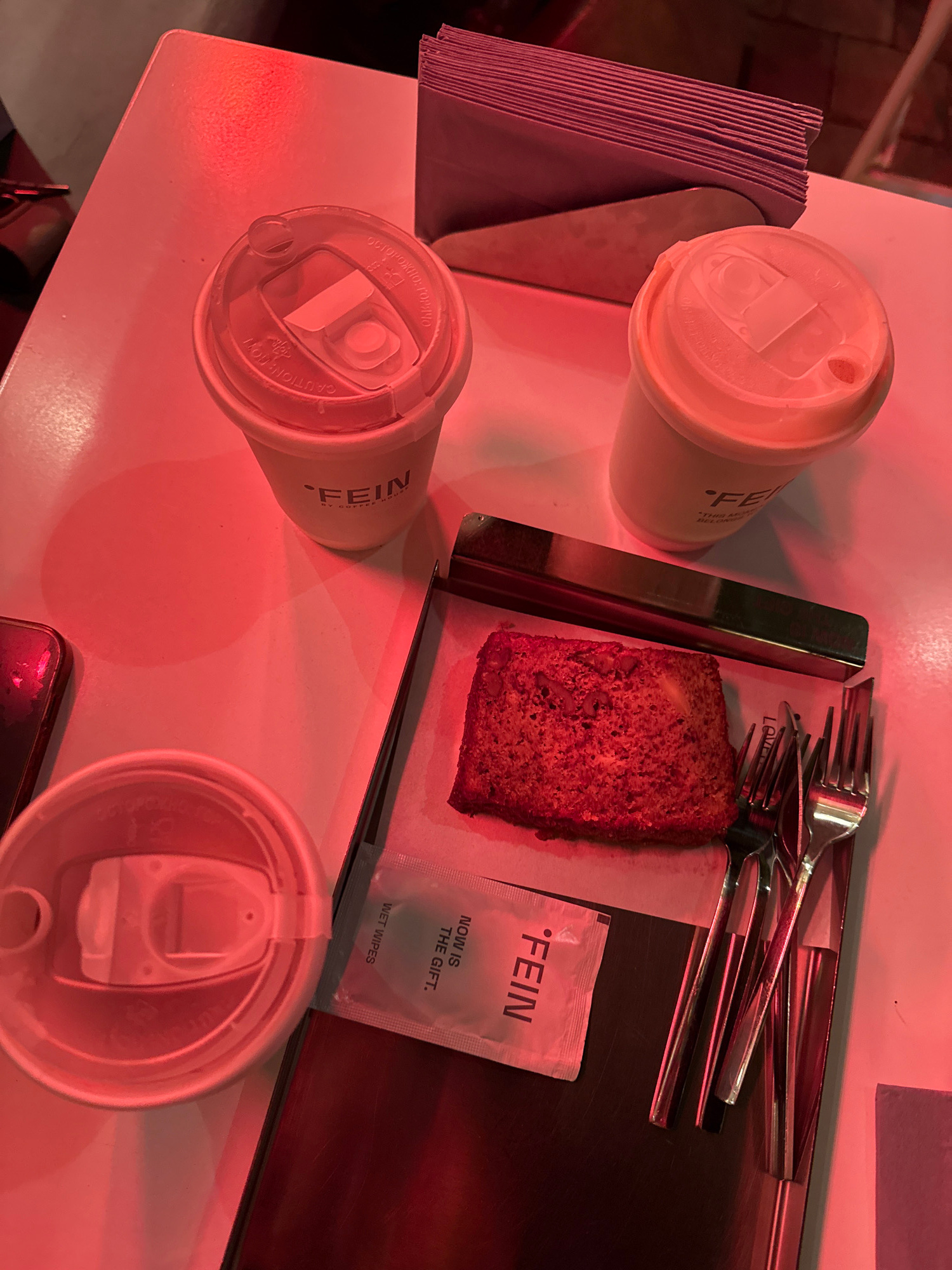 The image presents a top-down view of a table setting, likely in Yerevan, Armenia, based on the branding ("FEIN") present on the items. The table is predominantly white and bathed in a red light. Ther…read more