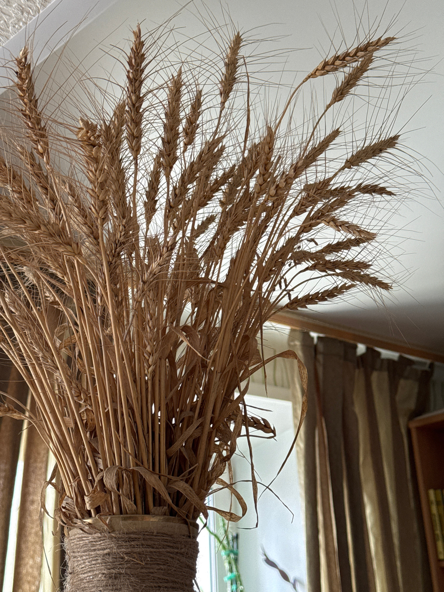 A bundle of dried wheat stalks is tied together with a rough, woven material. The stalks are a light brown color, and the individual grains of wheat are visible. The bundle is positioned in front of a…read more