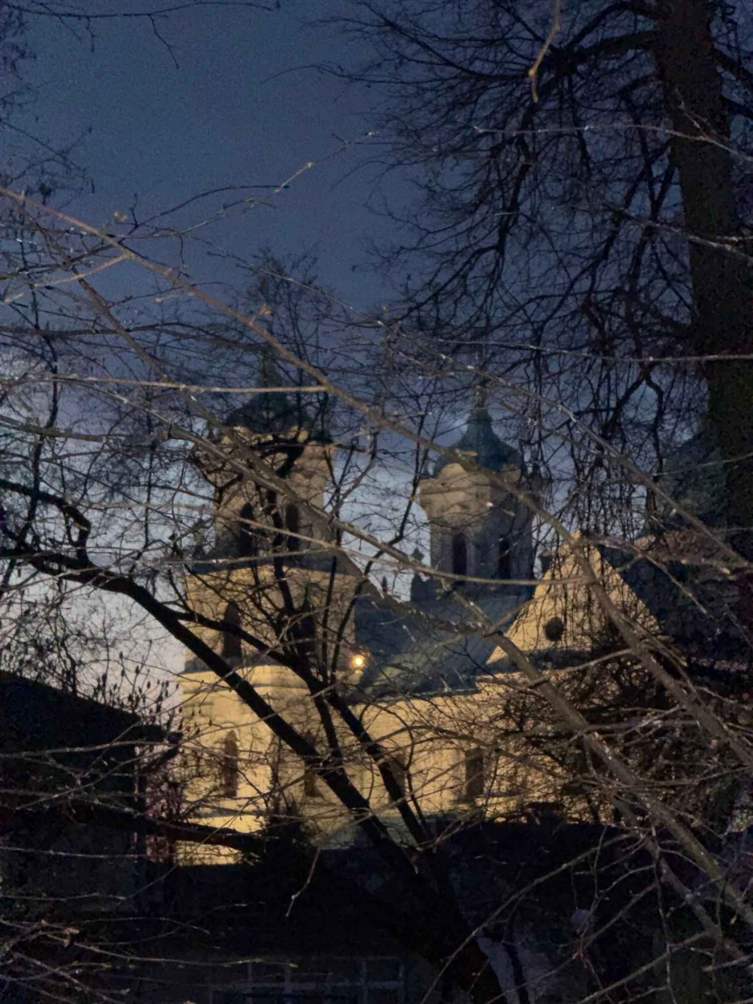 The image depicts a night scene in Hrodna, Belarus, with a building visible through the branches of bare trees. The building appears to be illuminated, with light emanating from windows. The overall s…read more