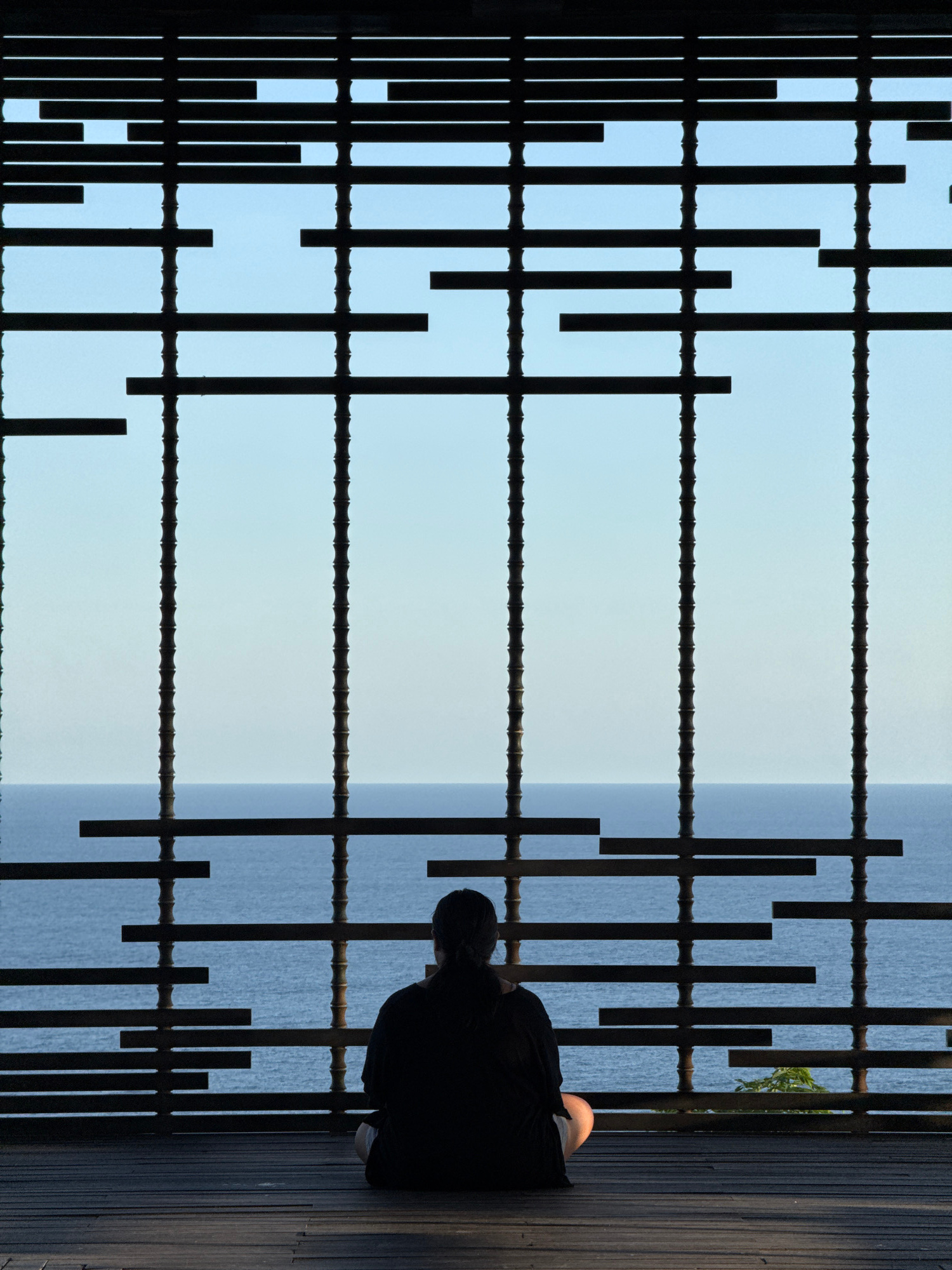 A person sits alone near a latticed fence on a wooden deck facing a body of water, possibly the ocean. The scene is dominated by the dark, vertically oriented latticework. The person is dressed in dar…read more