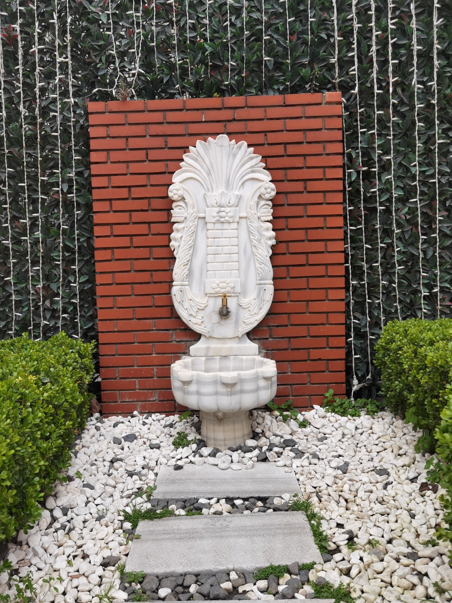 A marble fountain stands against a rectangular brick wall, with a backdrop of green foliage and string lights. The fountain features a tiered bowl and ornate carvings. A pathway of gray stones leads u…read more