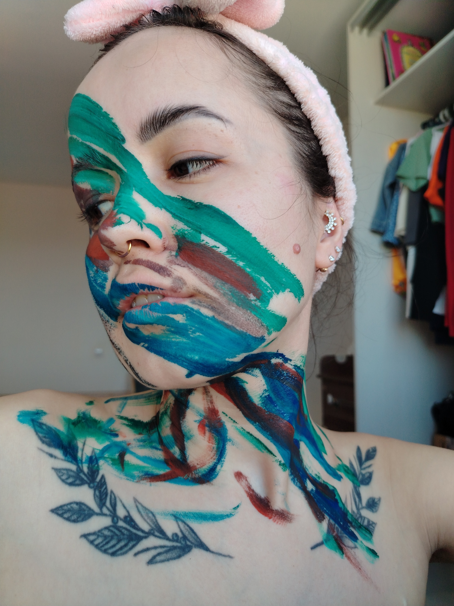 A close-up, slightly angled shot of a person with paint smeared on their face, neck, and upper chest. The paint is a mix of green, blue, and red hues. The person is wearing a pink headband with bunnyβ¦read more