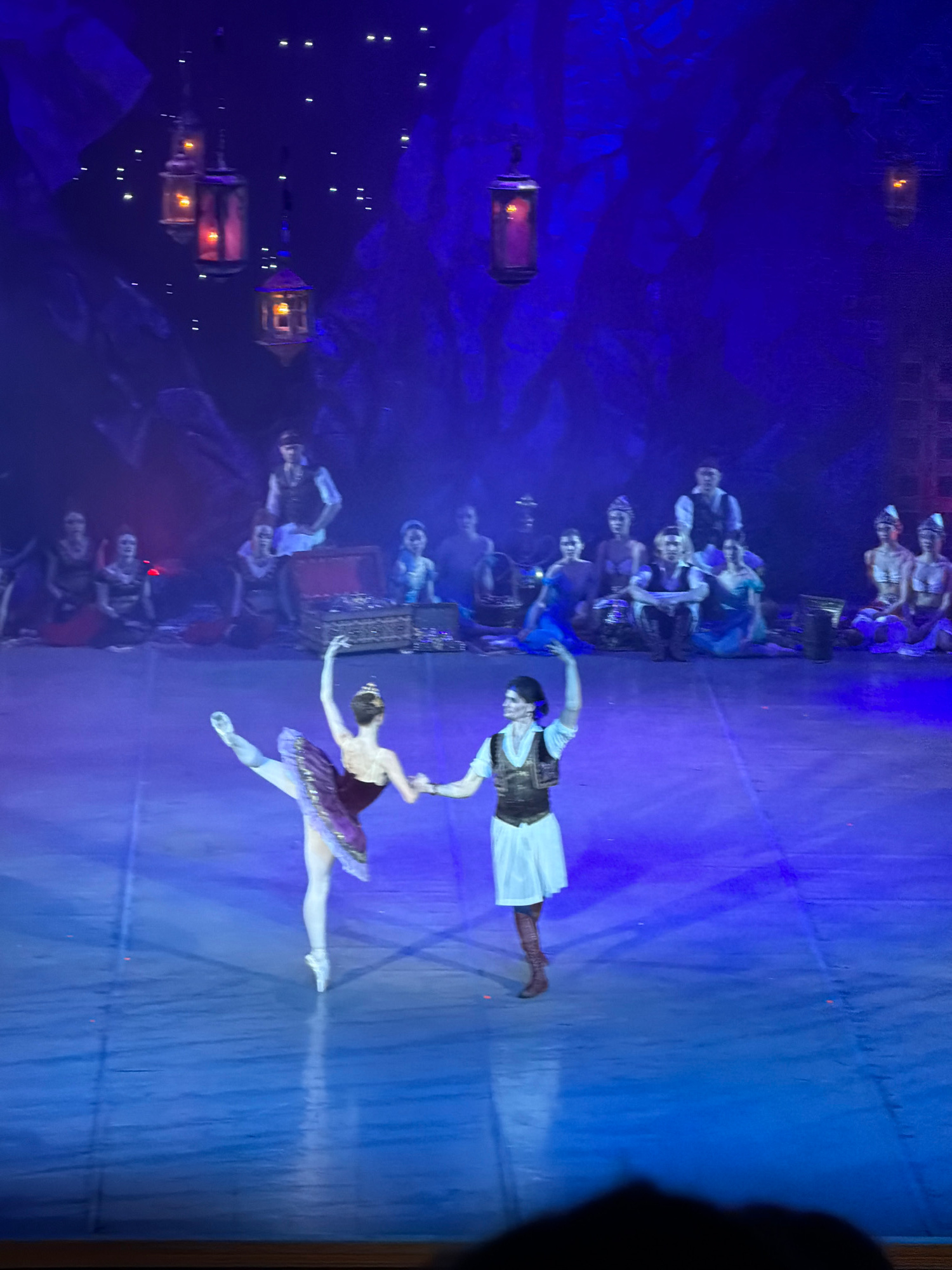 The image depicts a ballet performance in what appears to be the city of Izhevsk, Russia. Two principal dancers, a male and a female, are performing center stage under blue lighting. The female dancer…read more