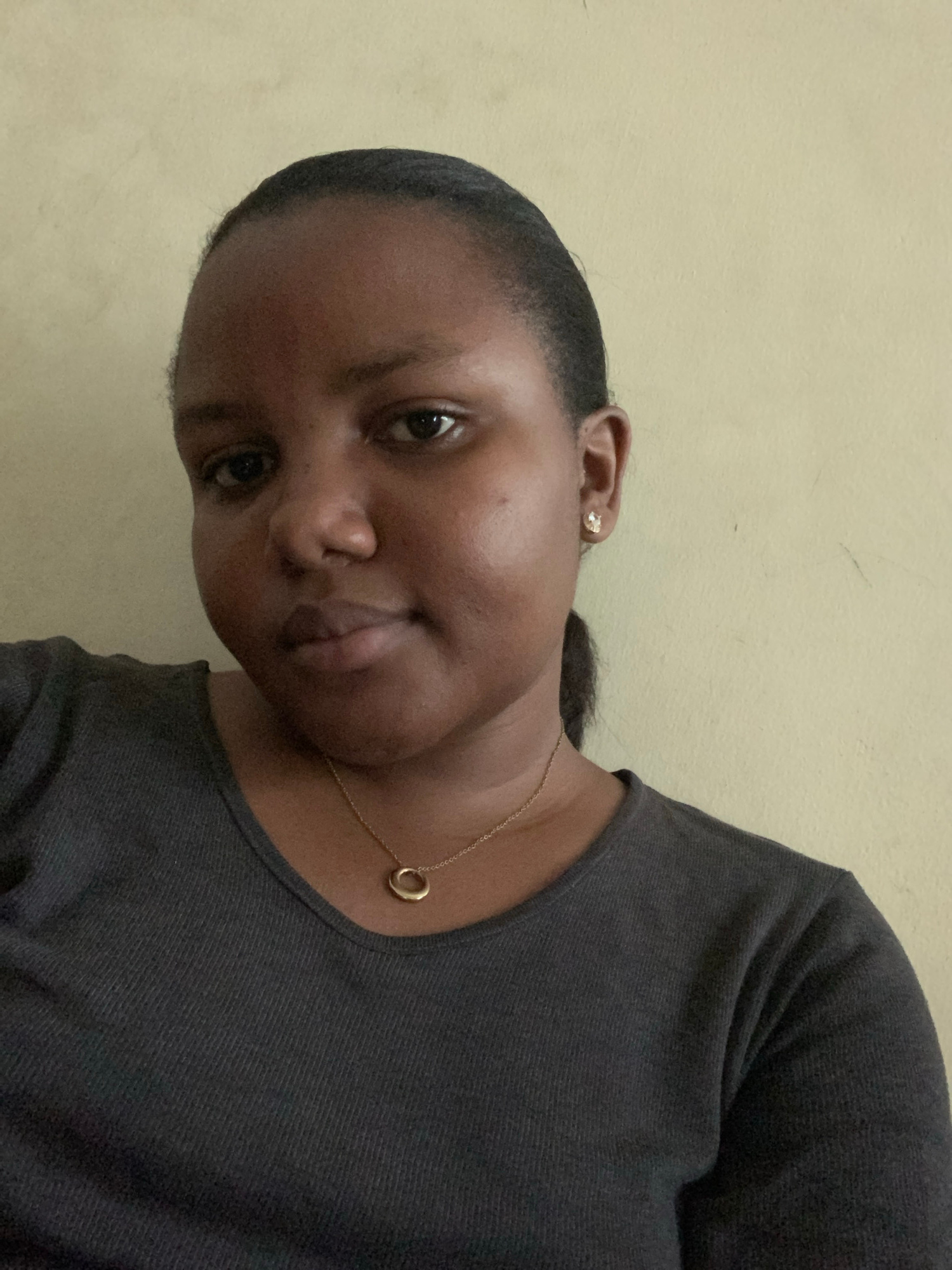 The image is a close-up portrait of a young adult woman with dark skin, positioned with a significant counter-clockwise tilt. She looks directly towards the camera with a neutral to slightly soft expr…read more