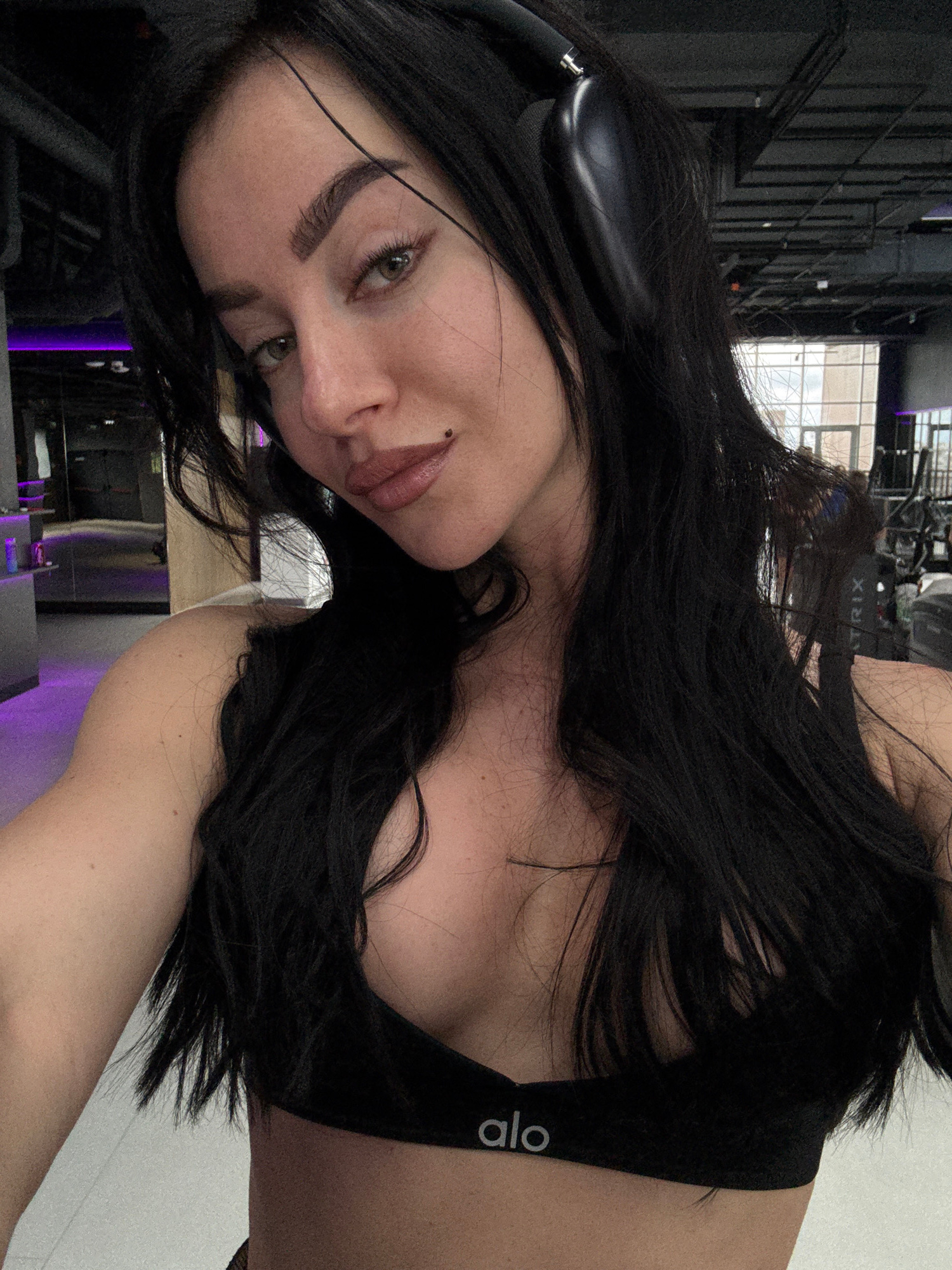 A woman is in a gym. She is wearing a black sports bra with "alo" on the strap and headphones. Her long black hair is partially obscuring her face. The gym has weight machines visible in the backgroun…read more