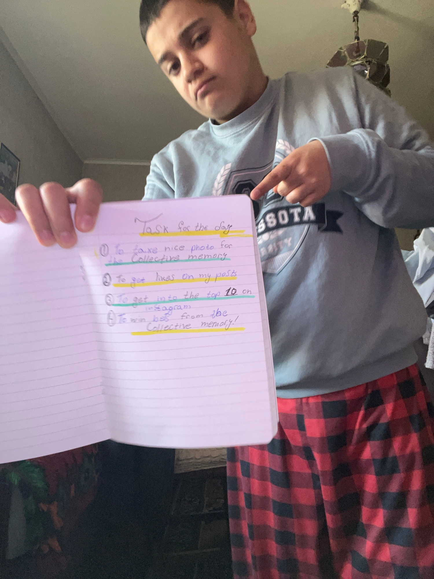 An indoor, low-angle shot in Lozarevo, Bulgaria, shows a young person, likely male, holding an open notebook toward the camera. The person, positioned in the upper left of the frame, wears a light blu…read more