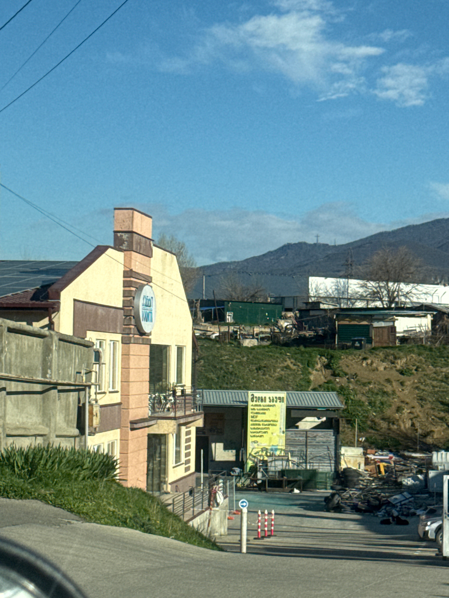 The image shows a view from a vehicle, possibly a car, in what appears to be a suburban or semi-urban setting. A building with a sign, likely a business or establishment, is situated on the left side…read more