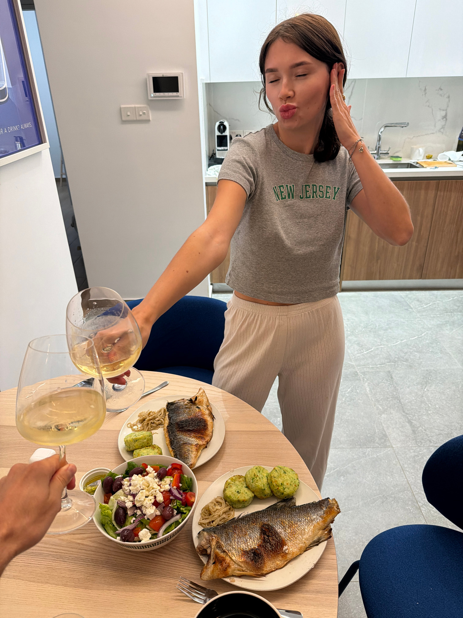 A woman in a grey "NEW JERSEY" t-shirt and off-white pants is pouring white wine into a wine glass. The image is taken indoors, possibly in an apartment in Livadia Larnakas, Cyprus. A round wooden tab…read more