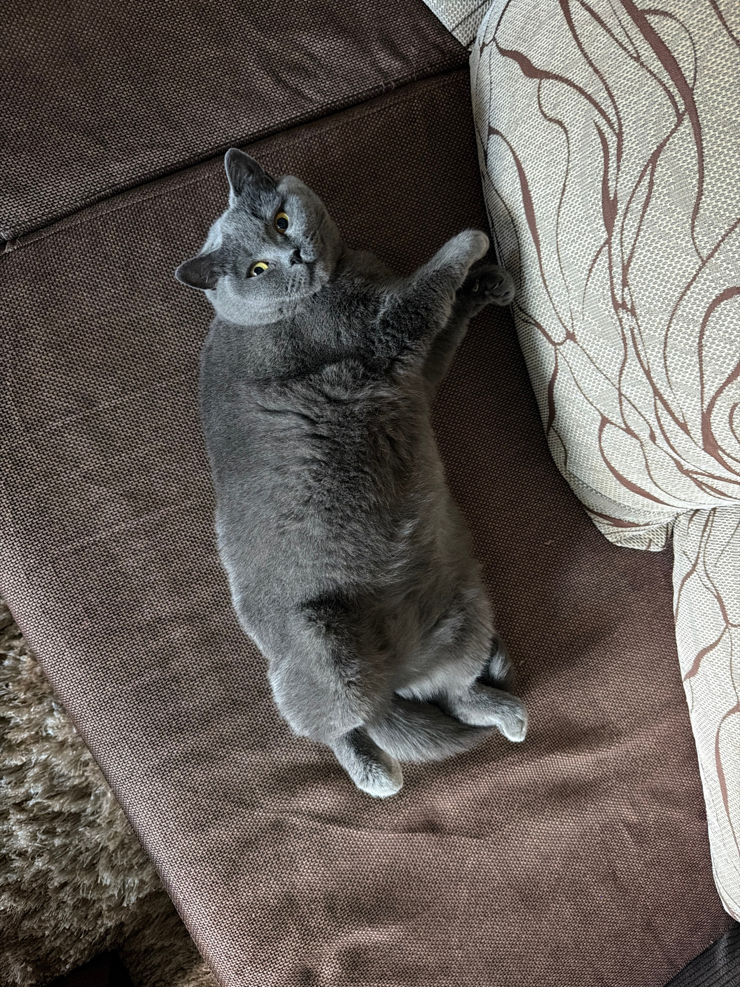 A gray cat is lying on its back on a brown upholstered sofa. The cat is positioned near a pillow with a beige and brown patterned design. The sofa is located indoors. The location is not verifiable as Rudartsi, Bulgaria without additional context. | Open Wire