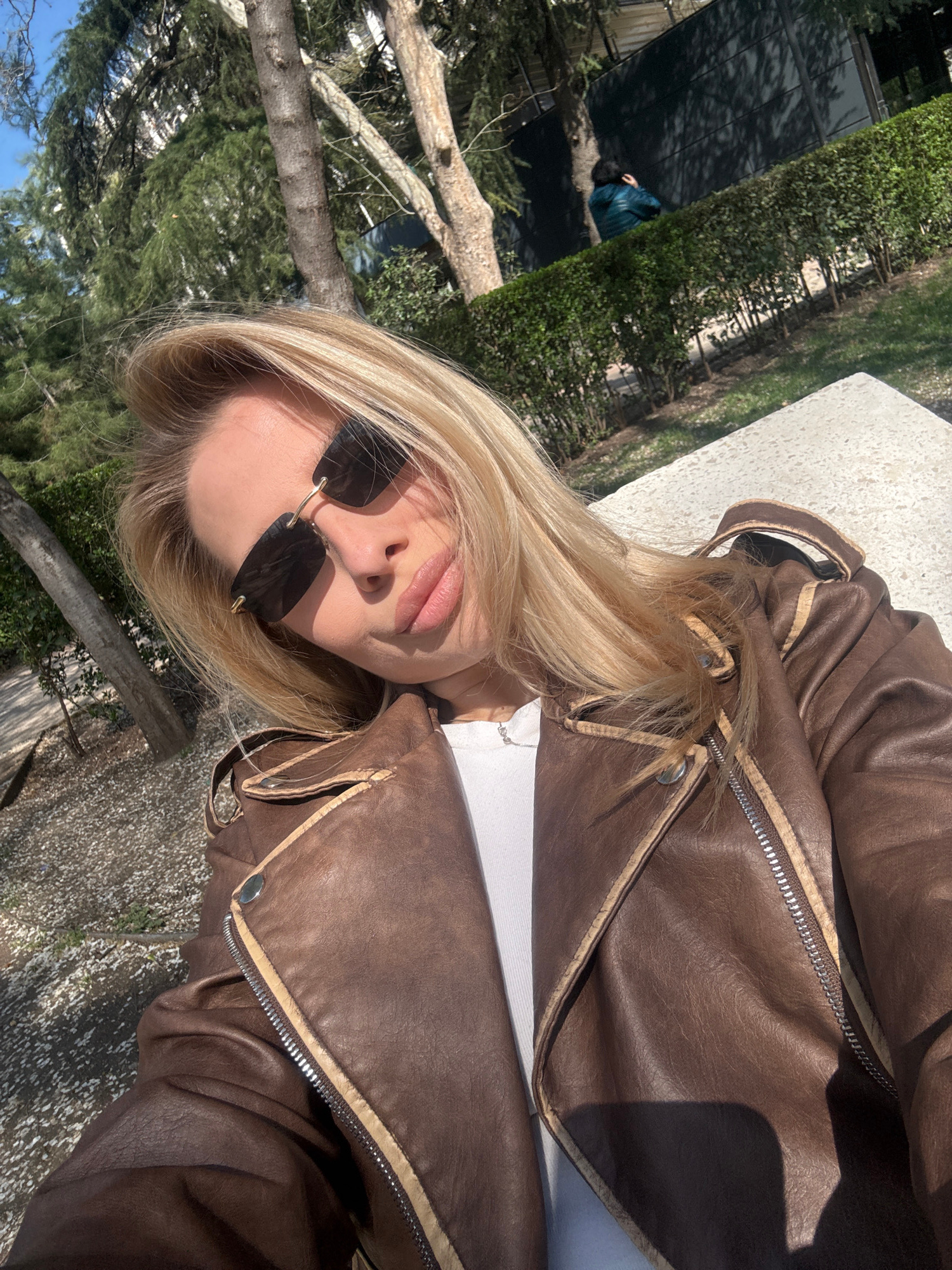A woman with blonde hair, wearing sunglasses and a brown leather jacket over a white shirt, is lying on a light-colored stone surface, possibly a bench or wall. The location appears to be outdoors, wi…read more
