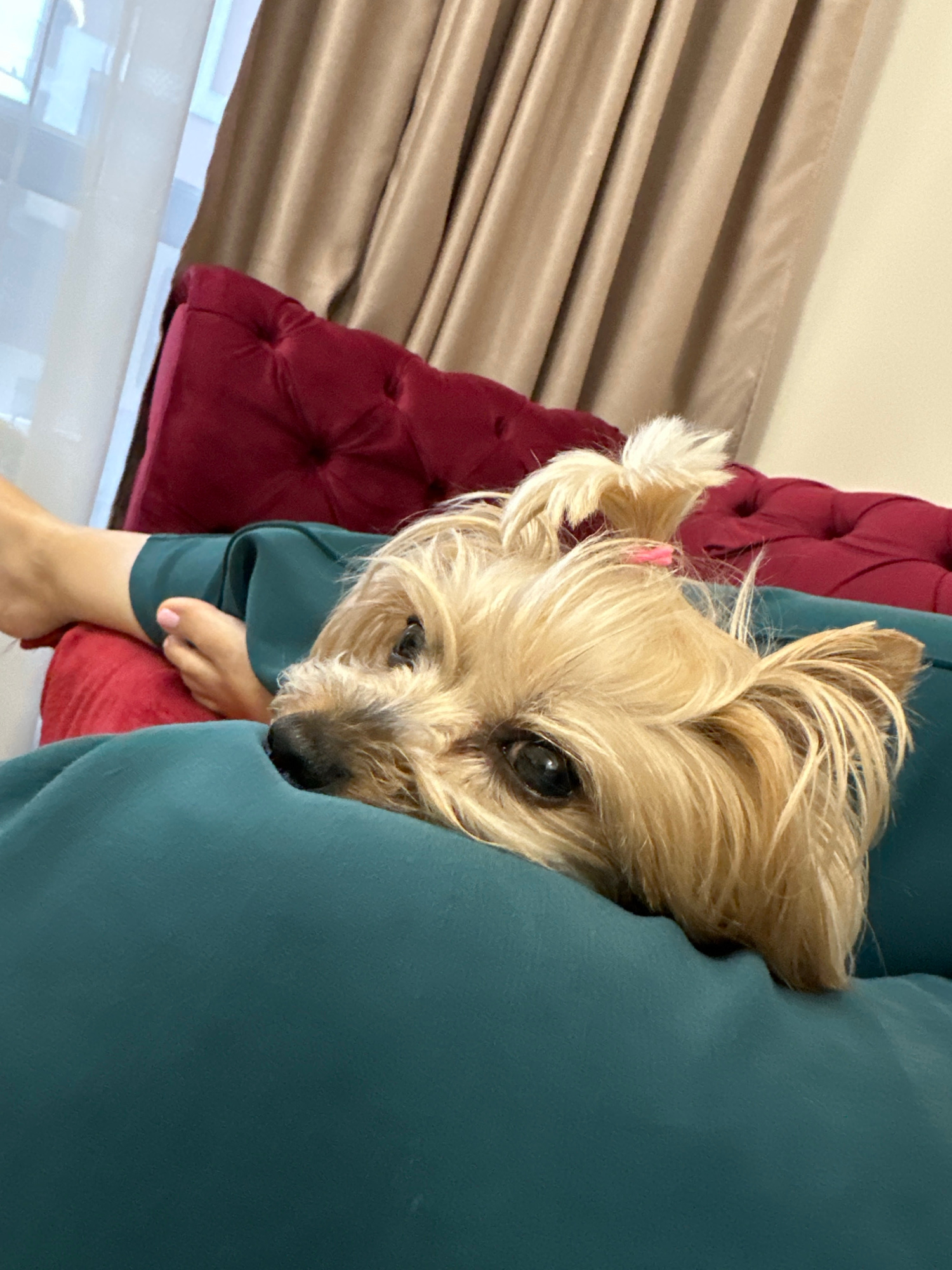 A small, tan-colored dog with long hair is nestled into a person's teal-colored garment. The dog has a small pink hair tie in its fur. The person is sitting on a red, tufted cushion. A tan curtain is…read more