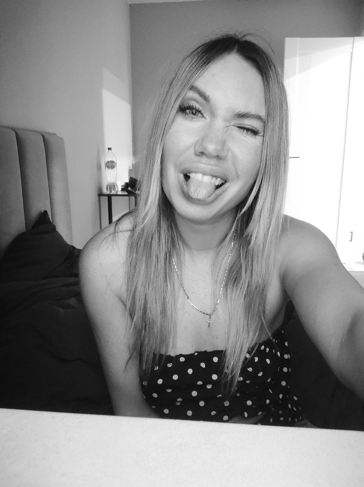 A black and white selfie shows a woman with long blonde hair, wearing a polka-dot top and a necklace with a cross pendant, winking and sticking out her tongue. She is indoors, possibly in a bedroom, a…read more