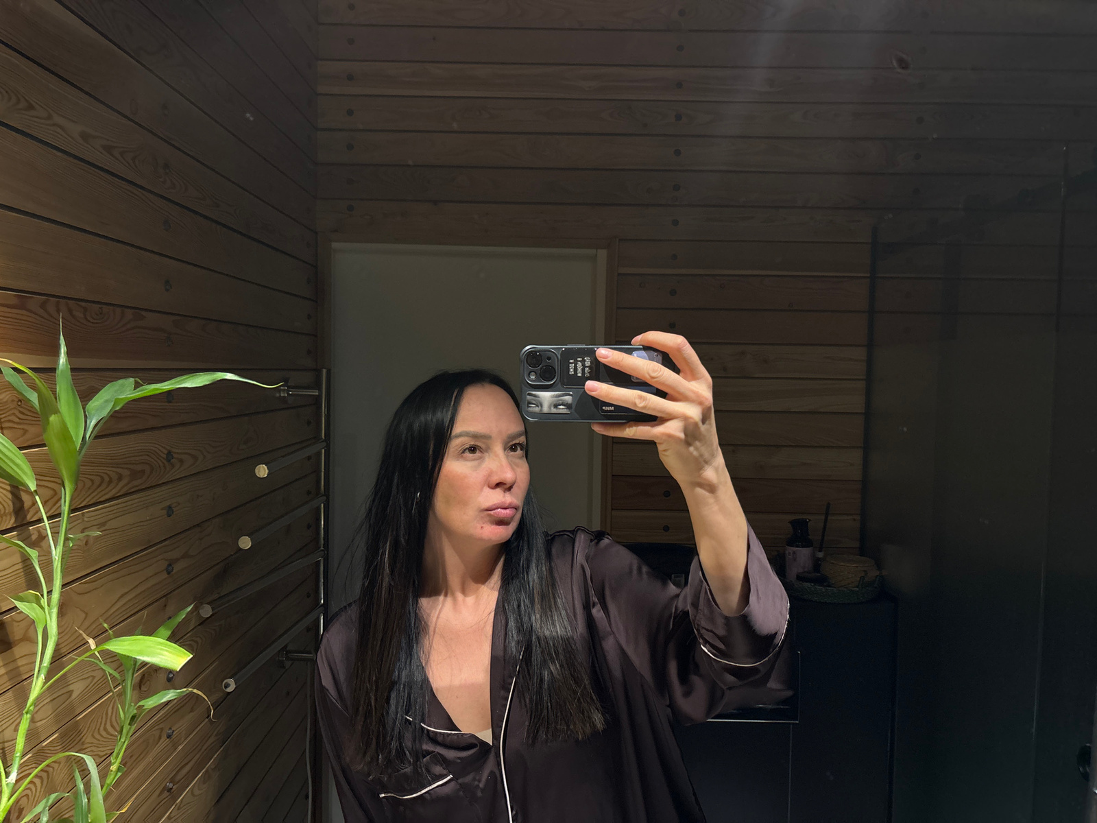 A person is taking a selfie in what appears to be a bathroom. The bathroom has a wooden plank wall and a bamboo plant in the lower left corner. The person is holding a smartphone with a black case up…read more