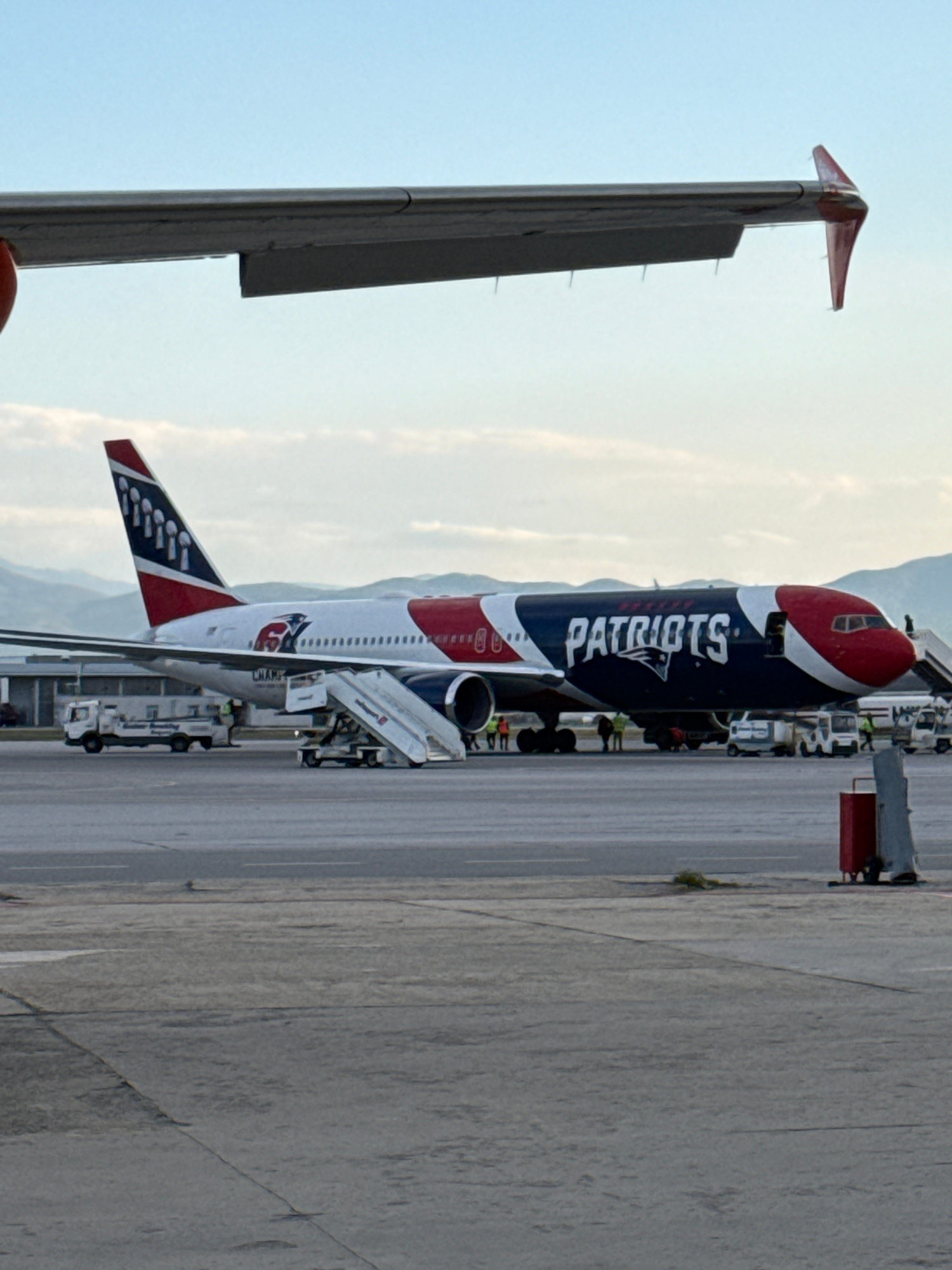 The image shows an airplane at Sofia Airport in Sofia, Bulgaria. The aircraft is branded with the New England Patriots logo and colors. The plane is parked at a gate, with support vehicles and peopleβ¦read more